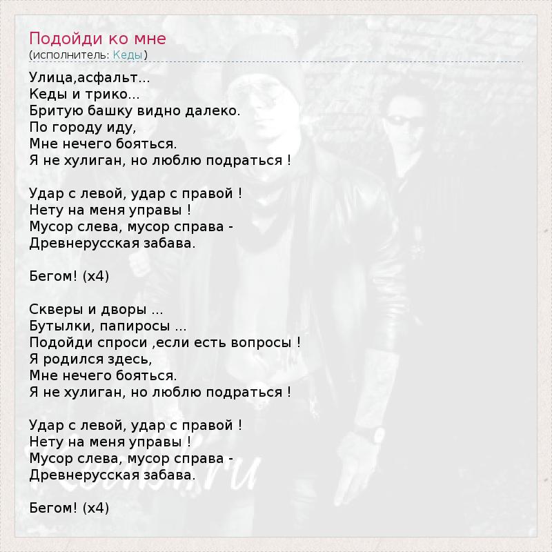 Улица,асфальт... Кеды и трико... Бритую башку видно далеко. По городу иду, Мне нечего бояться. Я не хулиган, но люблю подраться ! Удар с левой, удар с правой ! Нету на меня управы ! Мусор слева, мусор справа - Древнерусская забава. Бегом! (x4) Скверы и дворы ... Бутылки, папиросы ... Подойди спроси ,если есть вопросы ! Я родился здесь, Мне нечего бояться. Я не хулиган, но люблю подраться ! Удар с левой, удар с правой ! Нету на меня управы ! Мусор слева, мусор справа - Древнерусская забава. Бегом! (x4)