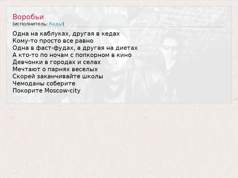 Одна на каблуках, другая в кедах Кому-то просто все равно Одна в фаст-фудах, а другая на диетах А кто-то по ночам с попкорном в кино Девчонки в городах и селах Мечтают о парнях веселых Скорей заканчивайте школы Чемоданы соберите Покорите Moscow-city