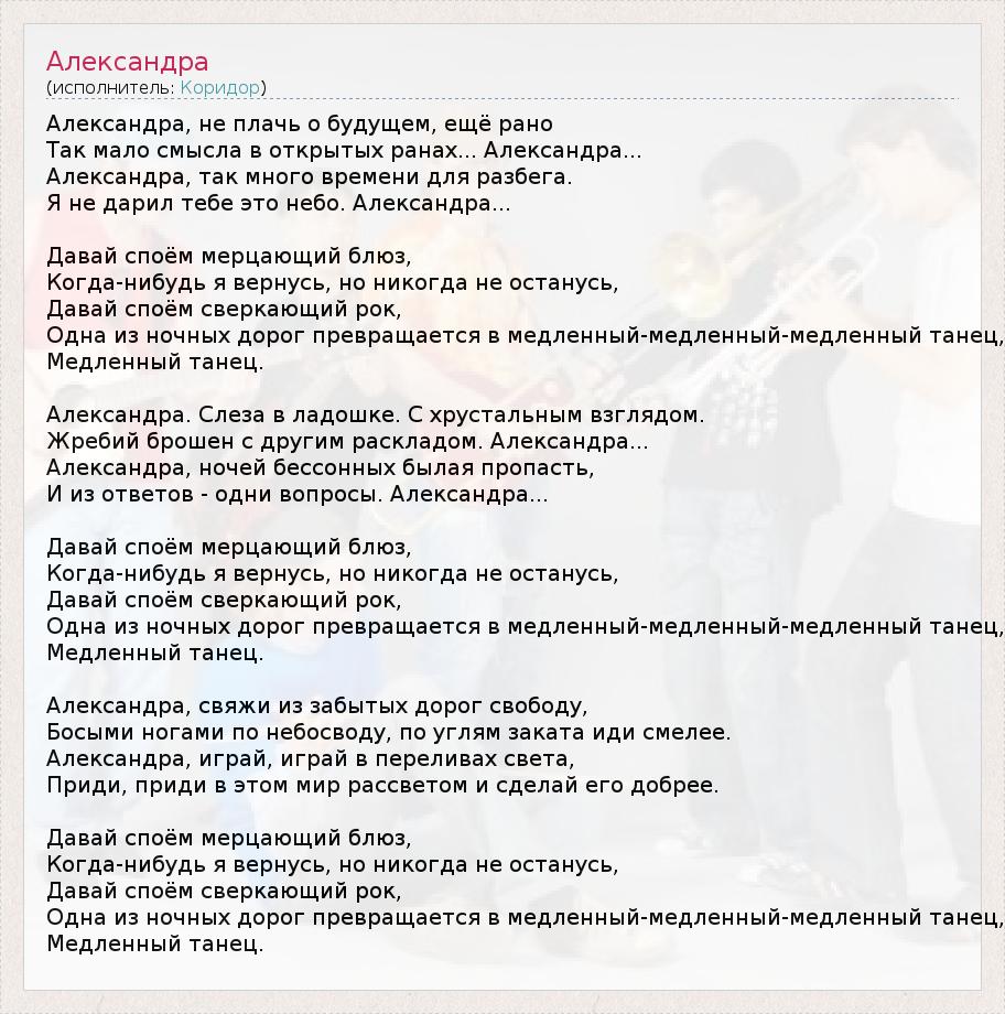Александра, не плачь о будущем, ещё рано Так мало смысла в открытых ранах... Александра... Александра, так много времени для разбега. Я не дарил тебе это небо. Александра... Давай споём мерцающий блюз, Когда-нибудь я вернусь, но никогда не останусь, Давай споём сверкающий рок, Одна из ночных дорог превращается в медленный-медленный-медленный танец, Медленный танец. Александра. Слеза в ладошке. С хрустальным взглядом. Жребий брошен с другим раскладом. Александра... Александра, ночей бессонных былая пропасть, И из ответов - одни вопросы. Александра... Давай споём мерцающий блюз, Когда-нибудь я вернусь, но никогда не останусь, Давай споём сверкающий рок, Одна из ночных дорог превращается в медленный-медленный-медленный танец, Медленный танец. Александра, свяжи из забытых дорог свободу, Босыми ногами по небосводу, по углям заката иди смелее. Александра, играй, играй в переливах света, Приди, приди в этом мир рассветом и сделай его добрее. Давай споём мерцающий блюз, Когда-нибудь я вернусь, но никогда не останусь, Давай споём сверкающий рок, Одна из ночных дорог превращается в медленный-медленный-медленный танец, Медленный танец.