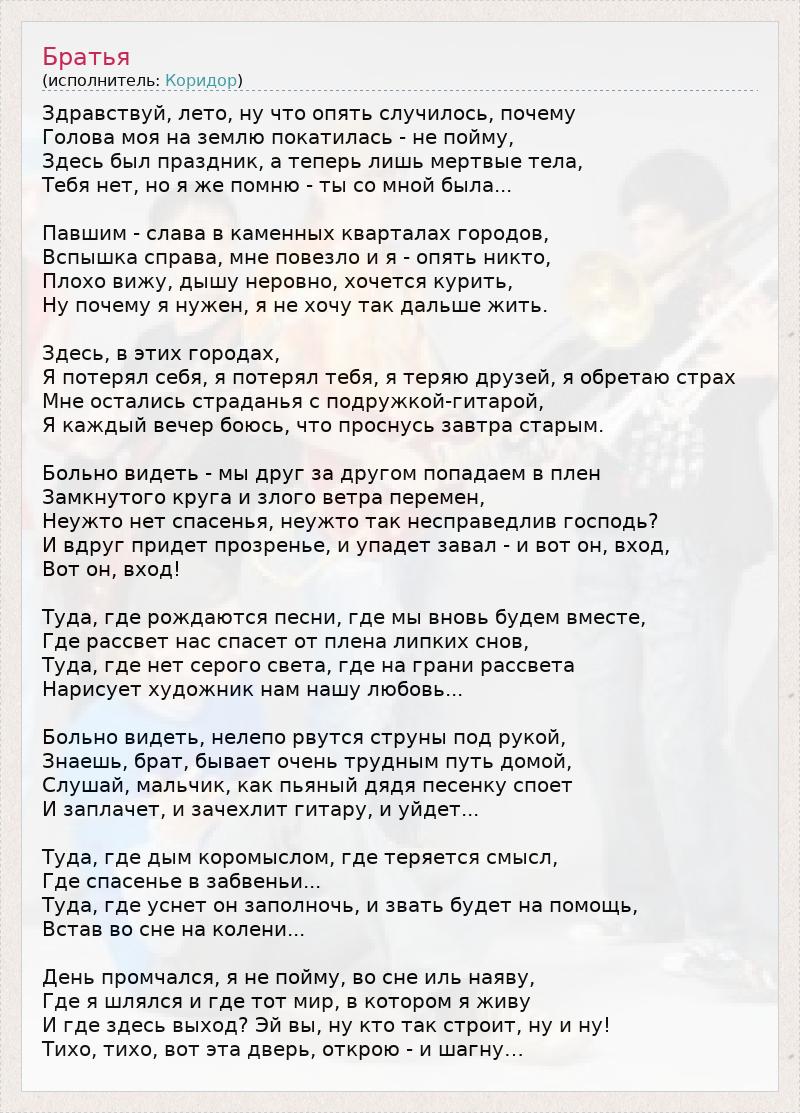 Здравствуй, лето, ну что опять случилось, почему Голова моя на землю покатилась - не пойму, Здесь был праздник, а теперь лишь мертвые тела, Тебя нет, но я же помню - ты со мной была... Павшим - слава в каменных кварталах городов, Вспышка справа, мне повезло и я - опять никто, Плохо вижу, дышу неровно, хочется курить, Ну почему я нужен, я не хочу так дальше жить. Здесь, в этих городах, Я потерял себя, я потерял тебя, я теряю друзей, я обретаю страх Мне остались страданья с подружкой-гитарой, Я каждый вечер боюсь, что проснусь завтра старым. Больно видеть - мы друг за другом попадаем в плен Замкнутого круга и злого ветра перемен, Неужто нет спасенья, неужто так несправедлив господь? И вдруг придет прозренье, и упадет завал - и вот он, вход, Вот он, вход! Туда, где рождаются песни, где мы вновь будем вместе, Где рассвет нас спасет от плена липких снов, Туда, где нет серого света, где на грани рассвета Нарисует художник нам нашу любовь... Больно видеть, нелепо рвутся струны под рукой, Знаешь, брат, бывает очень трудным путь домой, Слушай, мальчик, как пьяный дядя песенку споет И заплачет, и зачехлит гитару, и уйдет... Туда, где дым коромыслом, где теряется смысл, Где спасенье в забвеньи... Туда, где уснет он заполночь, и звать будет на помощь, Встав во сне на колени... День промчался, я не пойму, во сне иль наяву, Где я шлялся и где тот мир, в котором я живу И где здесь выход? Эй вы, ну кто так строит, ну и ну! Тихо, тихо, вот эта дверь, открою - и шагну…