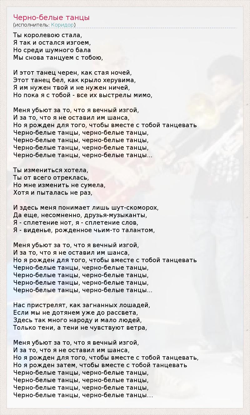 Ты королевою стала, Я так и остался изгоем, Но среди шумного бала Мы снова танцуем с тобою, И этот танец черен, как стая ночей, Этот танец бел, как крыло херувима, Я им нужен твой и не нужен ничей, Но пока я с тобой - все их выстрелы мимо, Меня убьют за то, что я вечный изгой, И за то, что я не оставил им шанса, Но я рожден для того, чтобы вместе с тобой танцевать Черно-белые танцы, черно-белые танцы, Черно-белые танцы, черно-белые танцы, Черно-белые танцы, черно-белые танцы, Черно-белые танцы, черно-белые танцы... Ты измениться хотела, Ты от всего отреклась, Но мне изменить не сумела, Хотя и пыталась не раз, И здесь меня понимает лишь шут-скоморох, Да еще, несомненно, друзья-музыканты, Я - сплетение нот, я - сплетение слов, Я - виденье, рожденное чьим-то талантом, Меня убьют за то, что я вечный изгой, И за то, что я не оставил им шанса, Но я рожден для того, чтобы вместе с тобой танцевать Черно-белые танцы, черно-белые танцы, Черно-белые танцы, черно-белые танцы, Черно-белые танцы, черно-белые танцы, Черно-белые танцы, черно-белые танцы... Нас пристрелят, как загнанных лошадей, Если мы не дотянем уже до рассвета, Здесь так много народу и мало людей, Только тени, а тени не чувствуют ветра, Меня убьют за то, что я вечный изгой, И за то, что я не оставил им шанса, Но я рожден для того, чтобы вместе с тобой танцевать, Но я рожден затем, чтобы вместе с тобой танцевать Черно-белые танцы, черно-белые танцы, Черно-белые танцы, черно-белые танцы, Черно-белые танцы, черно-белые танцы, Черно-белые танцы, черно-белые танцы…