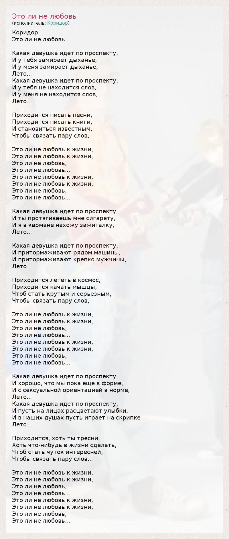 Коридор Это ли не любовь Какая девушка идет по проспекту, И у тебя замирает дыханье, И у меня замирает дыханье, Лето... Какая девушка идет по проспекту, И у тебя не находится слов, И у меня не находится слов, Лето... Приходится писать песни, Приходится писать книги, И становиться известным, Чтобы связать пару слов, Это ли не любовь к жизни, Это ли не любовь к жизни, Это ли не любовь, Это ли не любовь... Это ли не любовь к жизни, Это ли не любовь к жизни, Это ли не любовь, Это ли не любовь... Какая девушка идет по проспекту, И ты протягиваешь мне сигарету, И я в кармане нахожу зажигалку, Лето... Какая девушка идет по проспекту, И притормаживают рядом машины, И притормаживают крепко мужчины, Лето... Приходится лететь в космос, Приходится качать мышцы, Чтоб стать крутым и серьезным, Чтобы связать пару слов, Это ли не любовь к жизни, Это ли не любовь к жизни, Это ли не любовь, Это ли не любовь... Это ли не любовь к жизни, Это ли не любовь к жизни, Это ли не любовь, Это ли не любовь... Какая девушка идет по проспекту, И хорошо, что мы пока еще в форме, И с сексуальной ориентацией в норме, Лето... Какая девушка идет по проспекту, И пусть на лицах расцветают улыбки, И в наших душах пусть играет на скрипке Лето... Приходится, хоть ты тресни, Хоть что-нибудь в жизни сделать, Чтоб стать чуток интересней, Чтобы связать пару слов... Это ли не любовь к жизни, Это ли не любовь к жизни, Это ли не любовь, Это ли не любовь... Это ли не любовь к жизни, Это ли не любовь к жизни, Это ли не любовь, Это ли не любовь…