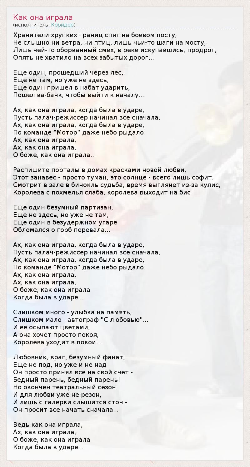Хранители хрупких границ спят на боевом посту, Не слышно ни ветра, ни птиц, лишь чьи-то шаги на мосту, Лишь чей-то оборванный смех, в реке искупавшись, продрог, Опять не хватило на всех забытых дорог... Еще один, прошедший через лес, Еще не там, но уже не здесь, Еще один пришел в набат ударить, Пошел ва-банк, чтобы выйти к началу... Ах, как она играла, когда была в ударе, Пусть палач-режиссер начинал все сначала, Ах, как она играла, когда была в ударе, По команде "Мотор" даже небо рыдало Ах, как она играла, Ах, как она играла, О боже, как она играла... Распишите порталы в домах красками новой любви, Этот занавес - просто туман, это солнце - всего лишь софит. Смотрит в зале в бинокль судьба, время выглянет из-за кулис, Королева с похмелья слаба, королева выходит на бис Еще один безумный партизан, Еще не здесь, но уже не там, Еще один в безудержном угаре Обломался о горб перевала... Ах, как она играла, когда была в ударе, Пусть палач-режиссер начинал все сначала, Ах, как она играла, когда была в ударе, По команде "Мотор" даже небо рыдало Ах, как она играла, Ах, как она играла, О боже, как она играла Когда была в ударе... Слишком много - улыбка на память, Слишком мало - автограф "С любовью"... И ее осыпают цветами, А она хочет просто покоя, Королева уходит в покои... Любовник, враг, безумный фанат, Еще не под, но уже и не над Он просто принял все на свой счет - Бедный парень, бедный парень! Но окончен театральный сезон И для любви уже не резон, И лишь с галерки слышится стон - Он просит все начать сначала... Ведь как она играла, Ах, как она играла, О боже, как она играла Когда была в ударе...