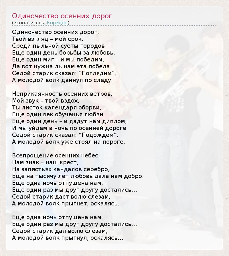 Одиночество осенних дорог, Твой взгляд – мой срок. Среди пыльной суеты городов Еще один день борьбы за любовь. Еще один миг – и мы победим, Да вот нужна ль нам эта победа… Седой старик сказал: “Поглядим”, А молодой волк двинул по следу. Неприкаянность осенних ветров, Мой звук – твой вздох, Ты листок календаря оборви, Еще один век обученья любви. Еще один день – и дадут нам диплом, И мы уйдем в ночь по осенней дороге Седой старик сказал: “Подождем”, А молодой волк уже стоял на пороге. Всепрощение осенних небес, Нам знак – наш крест, На запястьях кандалов серебро, Еще на тысячу лет любовь дала нам добро. Еще одна ночь отпущена нам, Еще один раз мы друг другу достались… Седой старик даст волю слезам, А молодой волк прыгнет, оскалясь. Еще одна ночь отпущена нам, Еще один раз мы друг другу достались… Седой старик дал волю слезам, А молодой волк прыгнул, оскалясь…