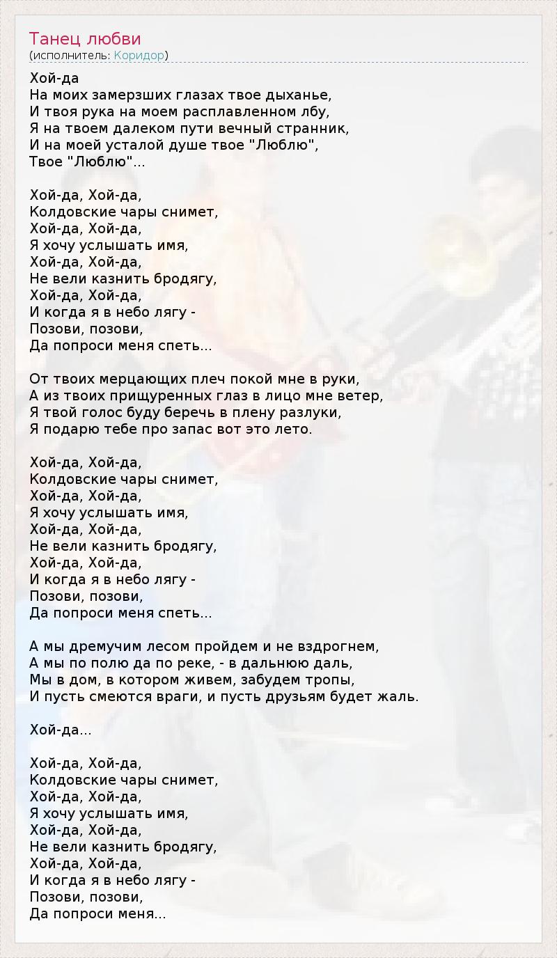 Хой-да На моих замерзших глазах твое дыханье, И твоя рука на моем расплавленном лбу, Я на твоем далеком пути вечный странник, И на моей усталой душе твое "Люблю", Твое "Люблю"... Хой-да, Хой-да, Колдовские чары снимет, Хой-да, Хой-да, Я хочу услышать имя, Хой-да, Хой-да, Не вели казнить бродягу, Хой-да, Хой-да, И когда я в небо лягу - Позови, позови, Да попроси меня спеть... От твоих мерцающих плеч покой мне в руки, А из твоих прищуренных глаз в лицо мне ветер, Я твой голос буду беречь в плену разлуки, Я подарю тебе про запас вот это лето. Хой-да, Хой-да, Колдовские чары снимет, Хой-да, Хой-да, Я хочу услышать имя, Хой-да, Хой-да, Не вели казнить бродягу, Хой-да, Хой-да, И когда я в небо лягу - Позови, позови, Да попроси меня спеть... А мы дремучим лесом пройдем и не вздрогнем, А мы по полю да по реке, - в дальнюю даль, Мы в дом, в котором живем, забудем тропы, И пусть смеются враги, и пусть друзьям будет жаль. Хой-да... Хой-да, Хой-да, Колдовские чары снимет, Хой-да, Хой-да, Я хочу услышать имя, Хой-да, Хой-да, Не вели казнить бродягу, Хой-да, Хой-да, И когда я в небо лягу - Позови, позови, Да попроси меня...