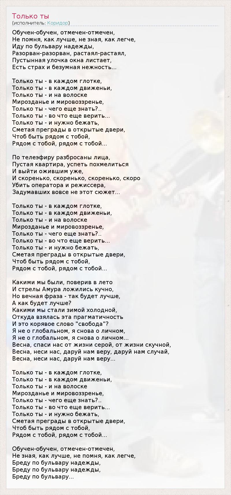 Trained trained marked - marked , Not remembering how better not knowing how easily Go along the boulevard hopes Broken - torn , faded , faded , Deserted street window scrolls , There is fear and crazy tenderness ... Only you - in every sip , Only you - in every movement , Only you - and in the balance Universe and worldview Only you - know what else ? .. Only you - what else to believe ... Only you - and you need to escape , Sweeping away the barriers to open doors To be close to you , Next to you , next to you ... TV air on scattered individuals Empty apartment , catch hangover And leave already revived , And skorenko , skorenko , skorenko soon Kill the cameraman and director , Conceived not this story ... Only you - in every sip , Only you - in every movement , Only you - and in the balance Universe and worldview Only you - know what else ? .. Only you - what else to believe ... Only you - and you need to escape , Sweeping away the barriers to open doors To be close to you , Next to you , next to you ... What we were believing in the summer And Cupid's arrow went heap , But eternal phrase - it would be better , And what would be better? What we have in the winter cold , Where did this pragmatism And this clumsy word "freedom" ? I'm not a global , I again about personal , I'm not a global , I again about personal ... Spring , save us from life gray , boring life , Spring , bring us , grant us faith , give us a case Spring , bring us , grant us faith ... Only you - in every sip , Only you - in every movement , Only you - and in the balance Universe and worldview Only you - know what else ? .. Only you - what else to believe ... Only you - and you need to escape , Sweeping away the barriers to open doors To be close to you , Next to you , next to you ... Trained trained marked - marked , Not knowing any better, not remembering how easily Walk along the boulevard hopes Walk along the boulevard hopes Walk along the boulevard ...