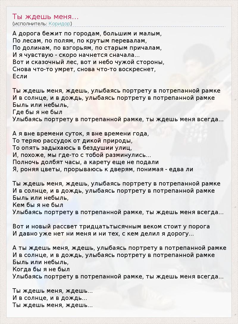 А дорога бежит по городам, большим и малым, По лесам, по полям, по крутым перевалам, По долинам, по взгорьям, по старым причалам, И я чувствую - скоро начнется сначала... Вот и сказочный лес, вот и небо чужой стороны, Снова что-то умрет, снова что-то воскреснет, Если Ты ждешь меня, ждешь, улыбаясь портрету в потрепанной рамке И в солнце, и в дождь, улыбаясь портрету в потрепанной рамке Быль или небыль, Где бы я не был Улыбаясь портрету в потрепанной рамке, ты ждешь меня всегда... А я вне времени суток, я вне времени года, То теряю рассудок от дикой природы, То опять задыхаюсь в бездушии улиц, И, похоже, мы где-то с тобой разминулись... Полночь долбят часы, а карету еще не подали Я, роняя цветы, прорываюсь к дверям, понимая - едва ли Ты ждешь меня, ждешь, улыбаясь портрету в потрепанной рамке И в солнце, и в дождь, улыбаясь портрету в потрепанной рамке Быль или небыль, Кем бы я не был Улыбаясь портрету в потрепанной рамке, ты ждешь меня всегда... Вот и новый рассвет тридцатьтысячным веком стоит у порога И давно уже нет ни меня и ни тех, с кем делил я дорогу... А ты ждешь меня, ждешь, улыбаясь портрету в потрепанной рамке И в солнце, и в дождь, улыбаясь портрету в потрепанной рамке Быль или небыль, Когда бы я не был Улыбаясь портрету в потрепанной рамке, ты ждешь меня всегда... Ты ждешь меня, ждешь... И в солнце, и в дождь... Ты ждешь меня, ждешь...