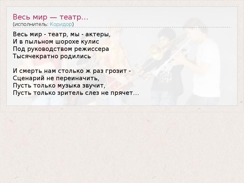 Весь мир - театр, мы - актеры, И в пыльном шорохе кулис Под руководством режиссера Тысячекратно родились И смерть нам столько ж раз грозит - Сценарий не переиначить, Пусть только музыка звучит, Пусть только зритель слез не прячет…