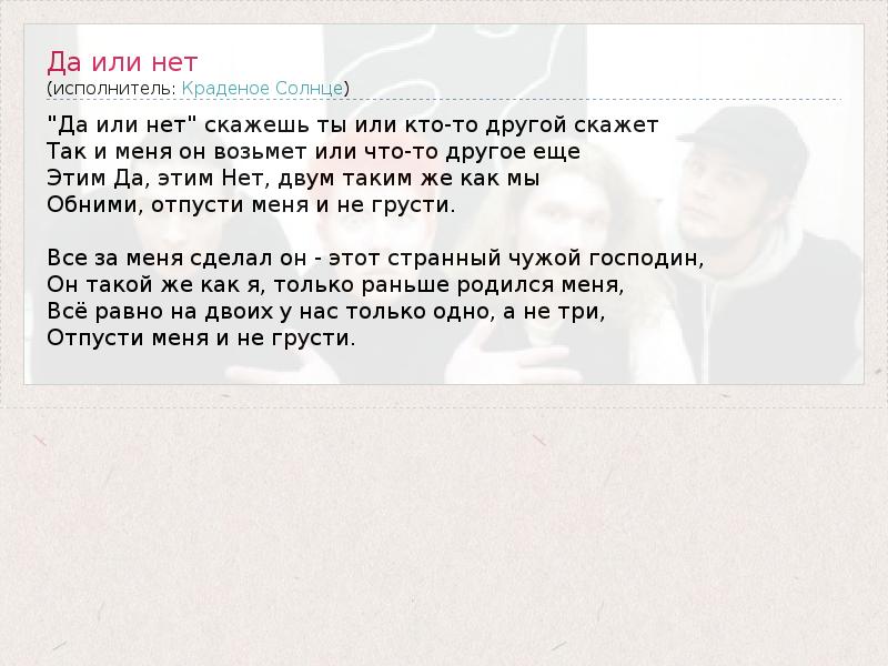 "Да или нет" скажешь ты или кто-то другой скажет Так и меня он возьмет или что-то другое еще Этим Да, этим Нет, двум таким же как мы Обними, отпусти меня и не грусти. Все за меня сделал он - этот странный чужой господин, Он такой же как я, только раньше родился меня, Всё равно на двоих у нас только одно, а не три, Отпусти меня и не грусти.