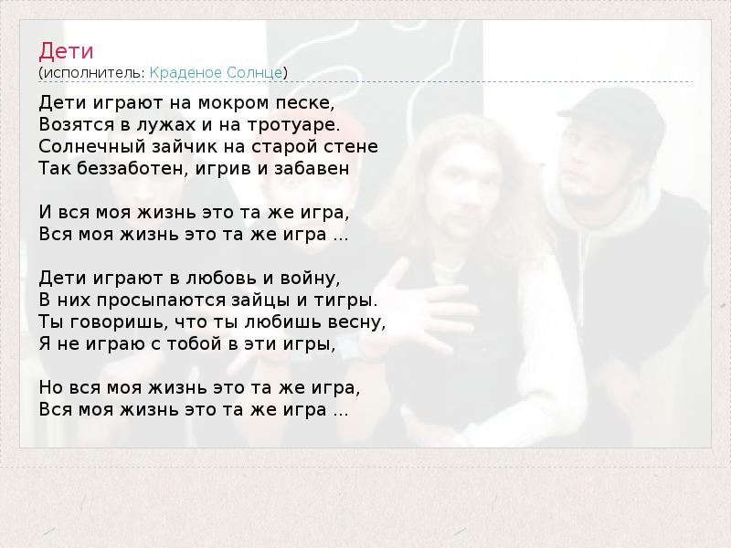 Дети играют на мокром песке, Возятся в лужах и на тротуаре. Солнечный зайчик на старой стене Так беззаботен, игрив и забавен И вся моя жизнь это та же игра, Вся моя жизнь это та же игра ... Дети играют в любовь и войну, В них просыпаются зайцы и тигры. Ты говоришь, что ты любишь весну, Я не играю с тобой в эти игры, Но вся моя жизнь это та же игра, Вся моя жизнь это та же игра ...