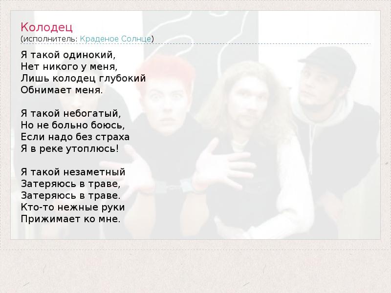 Я такой одинокий, Нет никого у меня, Лишь колодец глубокий Обнимает меня. Я такой небогатый, Но не больно боюсь, Если надо без страха Я в реке утоплюсь! Я такой незаметный Затеряюсь в траве, Затеряюсь в траве. Кто-то нежные руки Прижимает ко мне.