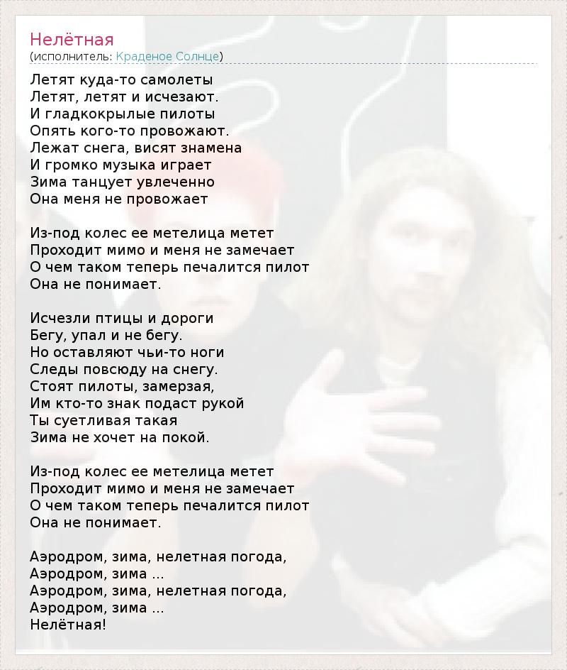 Летят куда-то самолеты Летят, летят и исчезают. И гладкокрылые пилоты Опять кого-то провожают. Лежат снега, висят знамена И громко музыка играет Зима танцует увлеченно Она меня не провожает Из-под колес ее метелица метет Проходит мимо и меня не замечает О чем таком теперь печалится пилот Она не понимает. Исчезли птицы и дороги Бегу, упал и не бегу. Но оставляют чьи-то ноги Следы повсюду на снегу. Стоят пилоты, замерзая, Им кто-то знак подаст рукой Ты суетливая такая Зима не хочет на покой. Из-под колес ее метелица метет Проходит мимо и меня не замечает О чем таком теперь печалится пилот Она не понимает. Аэродром, зима, нелетная погода, Аэродром, зима ... Аэродром, зима, нелетная погода, Аэродром, зима ... Нелётная!