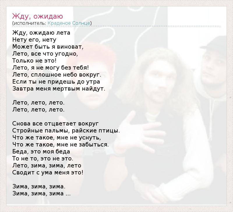 Жду, ожидаю лета Нету его, нету Может быть я виноват, Лето, все что угодно, Только не это! Лето, я не могу без тебя! Лето, сплошное небо вокруг. Если ты не придешь до утра Завтра меня мертвым найдут. Лето, лето, лето. Лето, лето, лето. Снова все отцветает вокруг Стройные пальмы, райские птицы. Что же такое, мне не уснуть, Что же такое, мне не забыться. Беда, это моя беда То не то, это не это. Лето, зима, зима, лето Сводит с ума меня это! Зима, зима, зима. Зима, зима, зимa ...