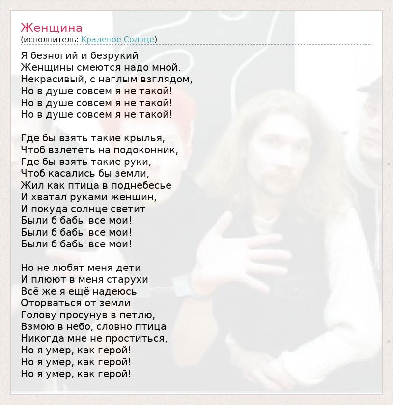 Я безногий и безрукий Женщины смеются надо мной. Некрасивый, с наглым взглядом, Но в душе совсем я не такой! Но в душе совсем я не такой! Но в душе совсем я не такой! Где бы взять такие крылья, Чтоб взлететь на подоконник, Где бы взять такие руки, Чтоб касались бы земли, Жил как птица в поднебесье И хватал руками женщин, И покуда солнце светит Были б бабы все мои! Были б бабы все мои! Были б бабы все мои! Но не любят меня дети И плюют в меня старухи Всё же я ещё надеюсь Оторваться от земли Голову просунув в петлю, Взмою в небо, словно птица Никогда мне не проститься, Но я умер, как герой! Но я умер, как герой! Но я умер, как герой!