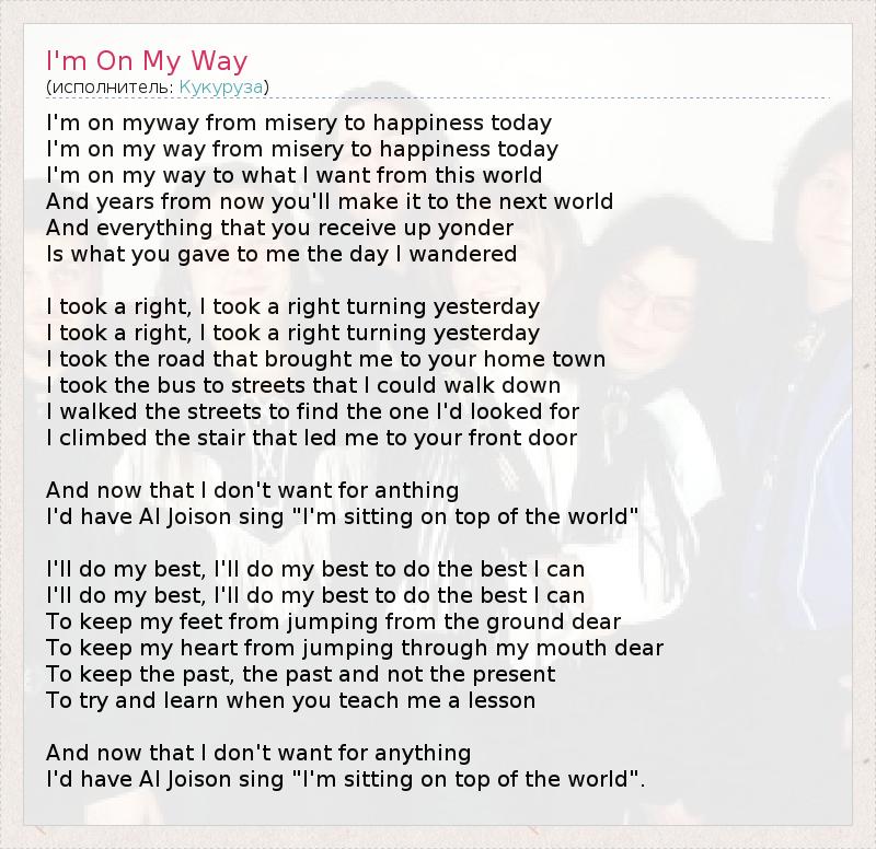 I'm on myway from misery to happiness today I'm on my way from misery to happiness today I'm on my way to what I want from this world And years from now you'll make it to the next world And everything that you receive up yonder Is what you gave to me the day I wandered I took a right, I took a right turning yesterday I took a right, I took a right turning yesterday I took the road that brought me to your home town I took the bus to streets that I could walk down I walked the streets to find the one I'd looked for I climbed the stair that led me to your front door And now that I don't want for anthing I'd have Al Joison sing "I'm sitting on top of the world" I'll do my best, I'll do my best to do the best I can I'll do my best, I'll do my best to do the best I can To keep my feet from jumping from the ground dear To keep my heart from jumping through my mouth dear To keep the past, the past and not the present To try and learn when you teach me a lesson And now that I don't want for anything I'd have Al Joison sing "I'm sitting on top of the world".