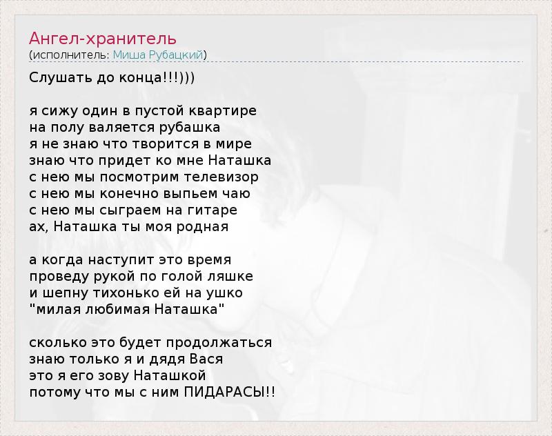 Слушать до конца!!!))) я сижу один в пустой квартире на полу валяется рубашка я не знаю что творится в мире знаю что придет ко мне Наташка с нею мы посмотрим телевизор с нею мы конечно выпьем чаю с нею мы сыграем на гитаре ах, Наташка ты моя родная а когда наступит это время проведу рукой по голой ляшке и шепну тихонько ей на ушко "милая любимая Наташка" сколько это будет продолжаться знаю только я и дядя Вася это я его зову Наташкой потому что мы с ним ПИДАРАСЫ!!