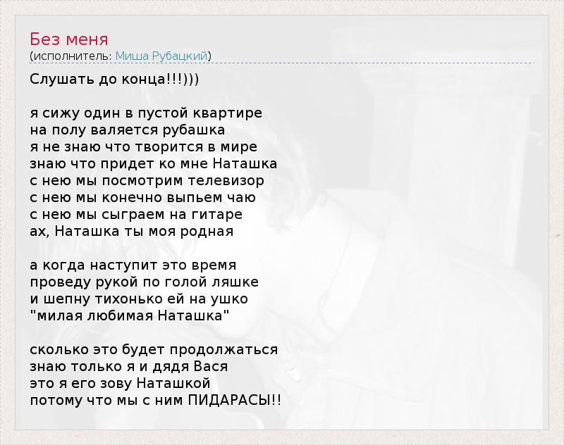 Слушать до конца!!!))) я сижу один в пустой квартире на полу валяется рубашка я не знаю что творится в мире знаю что придет ко мне Наташка с нею мы посмотрим телевизор с нею мы конечно выпьем чаю с нею мы сыграем на гитаре ах, Наташка ты моя родная а когда наступит это время проведу рукой по голой ляшке и шепну тихонько ей на ушко "милая любимая Наташка" сколько это будет продолжаться знаю только я и дядя Вася это я его зову Наташкой потому что мы с ним ПИДАРАСЫ!!