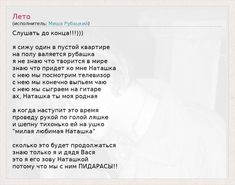 Слушать до конца!!!))) я сижу один в пустой квартире на полу валяется рубашка я не знаю что творится в мире знаю что придет ко мне Наташка с нею мы посмотрим телевизор с нею мы конечно выпьем чаю с нею мы сыграем на гитаре ах, Наташка ты моя родная а когда наступит это время проведу рукой по голой ляшке и шепну тихонько ей на ушко "милая любимая Наташка" сколько это будет продолжаться знаю только я и дядя Вася это я его зову Наташкой потому что мы с ним ПИДАРАСЫ!!