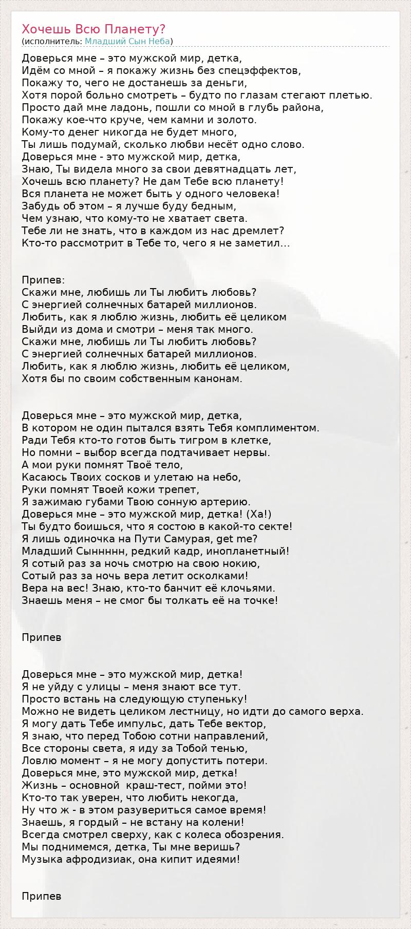 Доверься мне – это мужской мир, детка, Идём со мной – я покажу жизнь без спецэффектов, Покажу то, чего не достанешь за деньги, Хотя порой больно смотреть – будто по глазам стегают плетью. Просто дай мне ладонь, пошли со мной в глубь района, Покажу кое-что круче, чем камни и золото. Кому-то денег никогда не будет много, Ты лишь подумай, сколько любви несёт одно слово. Доверься мне - это мужской мир, детка, Знаю, Ты видела много за свои девятнадцать лет, Хочешь всю планету? Не дам Тебе всю планету! Вся планета не может быть у одного человека! Забудь об этом – я лучше буду бедным, Чем узнаю, что кому-то не хватает света. Тебе ли не знать, что в каждом из нас дремлет? Кто-то рассмотрит в Тебе то, чего я не заметил… Припев: Скажи мне, любишь ли Ты любить любовь? С энергией солнечных батарей миллионов. Любить, как я люблю жизнь, любить её целиком Выйди из дома и смотри – меня так много. Скажи мне, любишь ли Ты любить любовь? С энергией солнечных батарей миллионов. Любить, как я люблю жизнь, любить её целиком, Хотя бы по своим собственным канонам. Доверься мне – это мужской мир, детка, В котором не один пытался взять Тебя комплиментом. Ради Тебя кто-то готов быть тигром в клетке, Но помни – выбор всегда подтачивает нервы. А мои руки помнят Твоё тело, Касаюсь Твоих сосков и улетаю на небо, Руки помнят Твоей кожи трепет, Я зажимаю губами Твою сонную артерию. Доверься мне – это мужской мир, детка! (Ха!) Ты будто боишься, что я состою в какой-то секте! Я лишь одиночка на Пути Самурая, get me? Младший Сыннннн, редкий кадр, инопланетный! Я сотый раз за ночь смотрю на свою нокию, Сотый раз за ночь вера летит осколками! Вера на вес! Знаю, кто-то банчит её клочьями. Знаешь меня – не смог бы толкать её на точке! Припев Доверься мне – это мужской мир, детка! Я не уйду с улицы – меня знают все тут. Просто встань на следующую ступеньку! Можно не видеть целиком лестницу, но идти до самого верха. Я могу дать Тебе импульс, дать Тебе вектор, Я знаю, что перед Тобою сотни направлений, Все стороны света, я иду за Тобой тенью, Ловлю момент – я не могу допустить потери. Доверься мне, это мужской мир, детка! Жизнь – основной краш-тест, пойми это! Кто-то так уверен, что любить некогда, Ну что ж - в этом разувериться самое время! Знаешь, я гордый – не встану на колени! Всегда смотрел сверху, как с колеса обозрения. Мы поднимемся, детка, Ты мне веришь? Музыка афродизиак, она кипит идеями! Припев