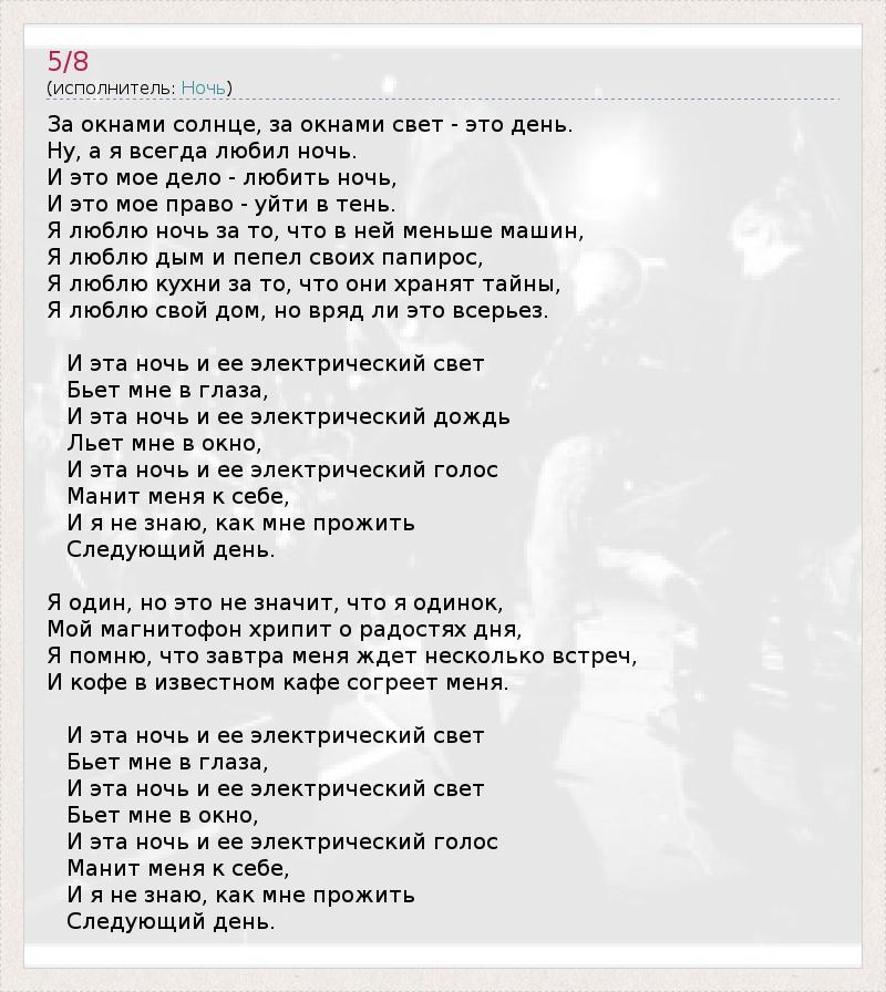 За окнами солнце, за окнами свет - это день. Ну, а я всегда любил ночь. И это мое дело - любить ночь, И это мое право - уйти в тень. Я люблю ночь за то, что в ней меньше машин, Я люблю дым и пепел своих папирос, Я люблю кухни за то, что они хранят тайны, Я люблю свой дом, но вряд ли это всерьез. И эта ночь и ее электрический свет Бьет мне в глаза, И эта ночь и ее электрический дождь Льет мне в окно, И эта ночь и ее электрический голос Манит меня к себе, И я не знаю, как мне прожить Следующий день. Я один, но это не значит, что я одинок, Мой магнитофон хрипит о радостях дня, Я помню, что завтра меня ждет несколько встреч, И кофе в известном кафе согреет меня. И эта ночь и ее электрический свет Бьет мне в глаза, И эта ночь и ее электрический свет Бьет мне в окно, И эта ночь и ее электрический голос Манит меня к себе, И я не знаю, как мне прожить Следующий день.