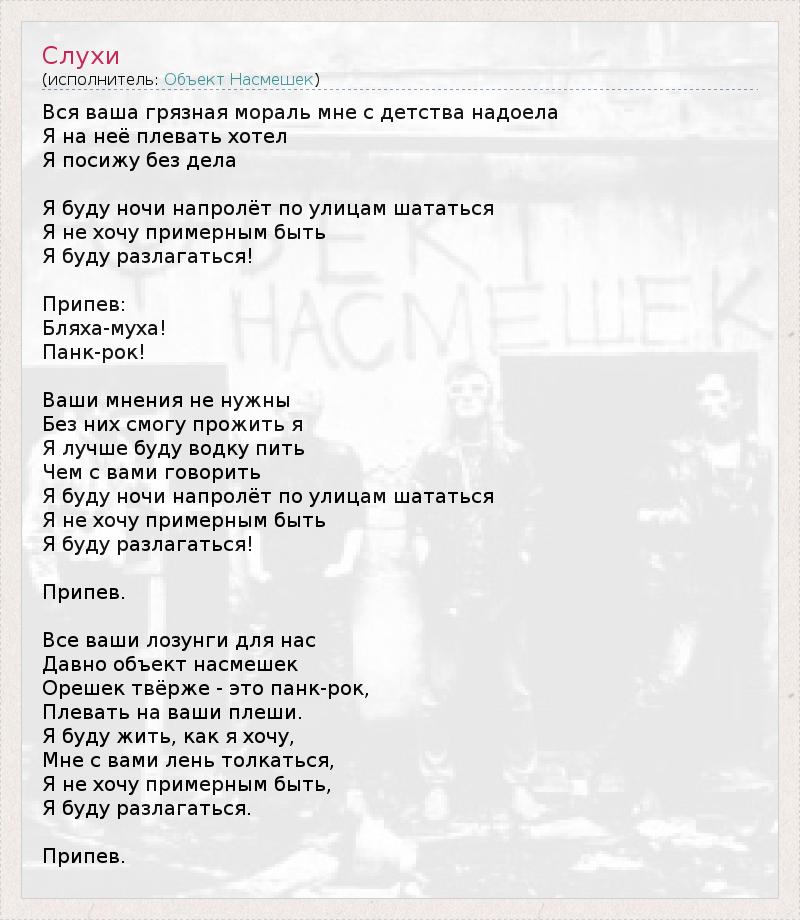 Вся ваша грязная мораль мне с детства надоела Я на неё плевать хотел Я посижу без дела Я буду ночи напролёт по улицам шататься Я не хочу примерным быть Я буду разлагаться! Припев: Бляха-муха! Панк-рок! Ваши мнения не нужны Без них смогу прожить я Я лучше буду водку пить Чем с вами говорить Я буду ночи напролёт по улицам шататься Я не хочу примерным быть Я буду разлагаться! Припев. Все ваши лозунги для нас Давно объект насмешек Орешек твёрже - это панк-рок, Плевать на ваши плеши. Я буду жить, как я хочу, Мне с вами лень толкаться, Я не хочу примерным быть, Я буду разлагаться. Припев.
