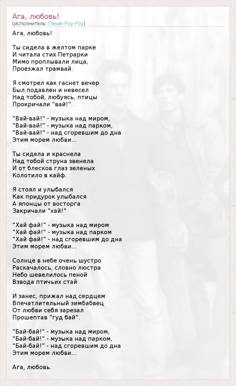 Ага, любовь! Ты сидела в желтом парке И читала стих Петрарки Мимо проплывали лица, Проезжал трамвай. Я смотрел как гаснет вечер Был подавлен и невесел Над тобой, любуясь, птицы Прокричали "вай!". "Вай-вай!" - музыка над миром, "Вай-вай!" - музыка над парком, "Вай-вай!" - над сгоревшим до дна Этим морем любви... Ты сидела и краснела Над тобой струна звенела И от блесков глаз зеленых Колотило в кайф. Я стоял и улыбался Как придурок улыбался А японцы от восторга Закричали "хай!" "Хай фай!" - музыка над миром "Хай фай!" - музыка над парком "Хай фай!" - над сгоревшим до дна Этим морем любви... Солнце в небе очень шустро Раскачалось, словно люстра Небо шевелилось пеной Взвода птичьих стай И занес, прижал над сердцем Впечатлительный зимбабвец От любви себя зарезал Прошептав "гуд бай". "Бай-бай!" - музыка над миром, "Бай-бай!" - музыка над парком, "Бай-бай!" - над сгоревшим до дна Этим морем любви... Ага, любовь.