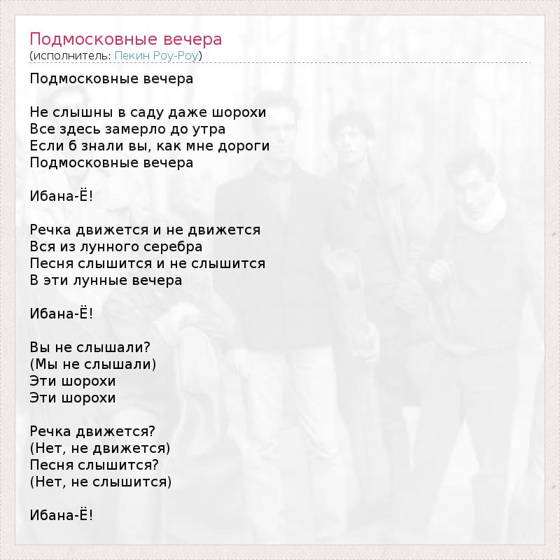 Подмосковные вечера Не слышны в саду даже шорохи Все здесь замерло до утра Если б знали вы, как мне дороги Подмосковные вечера Ибана-Ё! Речка движется и не движется Вся из лунного серебра Песня слышится и не слышится В эти лунные вечера Ибана-Ё! Вы не слышали? (Мы не слышали) Эти шорохи Эти шорохи Речка движется? (Нет, не движется) Песня слышится? (Нет, не слышится) Ибана-Ё!