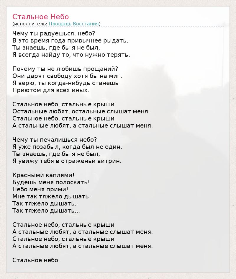 Чему ты радуешься, небо? В это время года привычнее рыдать. Ты знаешь, где бы я не был, Я всегда найду то, что нужно терять. Почему ты не любишь прощаний? Они дарят свободу хотя бы на миг. Я верю, ты когда-нибудь станешь Приютом для всех иных. Стальное небо, стальные крыши Остальные любят, остальные слышат меня. Стальное небо, стальные крыши А стальные любят, а стальные слышат меня. Чему ты печалишься небо? Я уже позабыл, когда был не один. Ты знаешь, где бы я не был, Я увижу тебя в отраженьи витрин. Красными каплями! Будешь меня полоскать! Небо меня прими! Мне так тяжело дышать! Так тяжело дышать. Так тяжело дышать... Стальное небо, стальные крыши А стальные любят, а стальные слышат меня. Стальное небо, стальные крыши А стальные любят, а стальные слышат меня. Стальное небо.