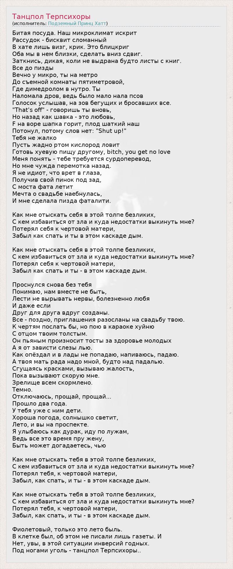Битая посуда. Наш микроклимат искрит Рассудок - бисквит сломанный В хате лишь визг, крик. Это блицкриг Оба мы в нем близки, сделать вниз сдвиг. Заткнись, дикая, коли не выдрана будто листы с книг. Все до пизды Вечно у микро, ты на метро До съемной комнаты пятиметровой, Где димедролом в нутро. Ты Наломала дров, ведь было мало нала псов Голосок услышав, на зов бегущих и бросавших все. "That's off" - говоришь ты вновь, Но назад как шавка - это любовь, F на воре шапка горит, плод шаткий наш Потонул, потому слов нет: "Shut up!" Тебя не жалко Пусть жадно ртом кислород ловит Готовь хуевую пищу другому, bitch, you get no love Меня понять - тебе требуется сурдоперевод, Но мне чужда перемотка назад. Я не идиот, что врет в глаза, Получив свой пинок под зад, С моста фата летит Мечта о свадьбе наебнулась, И мне сделала пизда фаталити. Как мне отыскать себя в этой толпе безликих, С кем избавиться от зла и куда недостатки выкинуть мне? Потерял себя к чертовой матери, Забыл как спать и ты в этом каскаде дым. Как мне отыскать себя в этой толпе безликих, С кем избавиться от зла и куда недостатки выкинуть мне? Потерял себя к чертовой матери, Забыл как спать и ты - в этом каскаде дым. Проснулся снова без тебя Понимаю, нам вместе не быть, Лести не вырывать нервы, болезненно любя И даже если Друг для друга вдруг созданы. Все - поздно, приглашения разосланы на свадьбу твою. К чертям послать бы, но пою в караоке хуйню С отцом твоим толстым. Он пьяным произносит тосты за здоровье молодых А я от зависти слезы лью. Как опёздал и в лады не попадаю, напиваюсь, падаю. А твоя мать рада надо мной, будто над падалью. Сгущаясь красками, вызываю жалость, Пока вызывают скорую мне. Зрелище всем скормлено. Темно. Отключаюсь, прощай, прощай... Прошло два года. У тебя уже с ним дети. Хороша погода, солнышко светит, Лето, и вы на проспекте. Я улыбаюсь как дурак, иду по лужам, Ведь все это время пру жену, Быть может догадаетесь, чью Как мне отыскать тебя в этой толпе безликих, С кем избавиться от зла и куда недостатки выкинуть мне? Потерял тебя, к чертовой матери, Забыл, как спать, и ты - в этом каскаде дым. Как мне отыскать тебя в этой толпе безликих, С кем избавиться от зла и куда недостатки выкинуть мне? Потерял тебя, к чертовой матери, Забыл, как спать, и ты - в этом каскаде дым. Фиолетовый, только это лето быль. В клетке был, об этом не писали лишь газеты. И Нет, увы, в этой ситуации инверсий годных. Под ногами уголь - танцпол Терпсихоры..
