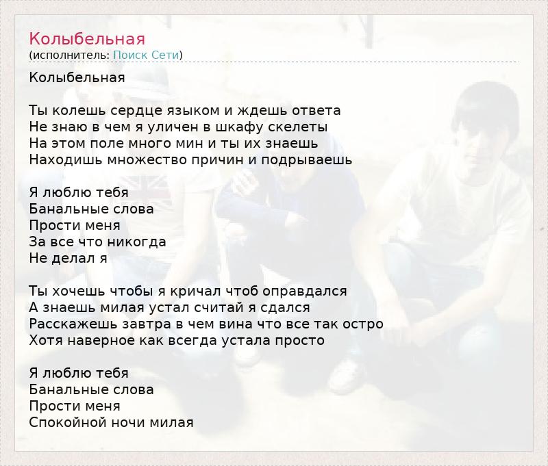 Колыбельная Ты колешь сердце языком и ждешь ответа Не знаю в чем я уличен в шкафу скелеты На этом поле много мин и ты их знаешь Находишь множество причин и подрываешь Я люблю тебя Банальные слова Прости меня За все что никогда Не делал я Ты хочешь чтобы я кричал чтоб оправдался А знаешь милая устал считай я сдался Расскажешь завтра в чем вина что все так остро Хотя наверное как всегда устала просто Я люблю тебя Банальные слова Прости меня Спокойной ночи милая