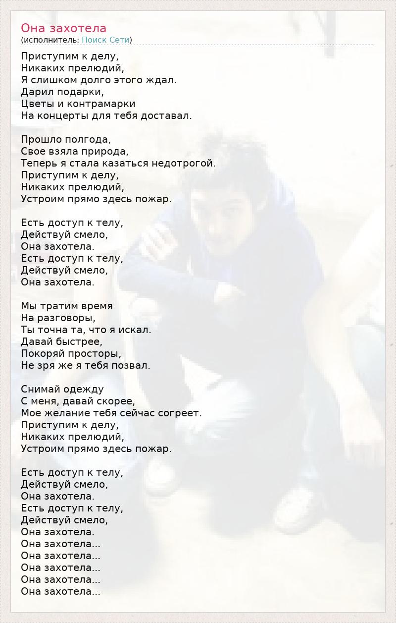 Приступим к делу, Никаких прелюдий, Я слишком долго этого ждал. Дарил подарки, Цветы и контрамарки На концерты для тебя доставал. Прошло полгода, Свое взяла природа, Теперь я стала казаться недотрогой. Приступим к делу, Никаких прелюдий, Устроим прямо здесь пожар. Есть доступ к телу, Действуй смело, Она захотела. Есть доступ к телу, Действуй смело, Она захотела. Мы тратим время На разговоры, Ты точна та, что я искал. Давай быстрее, Покоряй просторы, Не зря же я тебя позвал. Снимай одежду С меня, давай скорее, Мое желание тебя сейчас согреет. Приступим к делу, Никаких прелюдий, Устроим прямо здесь пожар. Есть доступ к телу, Действуй смело, Она захотела. Есть доступ к телу, Действуй смело, Она захотела. Она захотела... Она захотела... Она захотела... Она захотела... Она захотела...