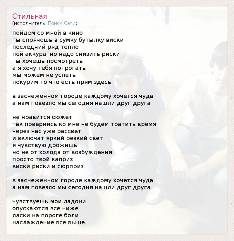 пойдем со мной в кино ты спрячешь в сумку бутылку виски последний ряд тепло пей аккуратно надо снизить риски ты хочешь посмотреть а я хочу тебя потрогать мы можем не успеть покурим то что есть прям здесь в заснеженном городе каждому хочется чуда а нам повезло мы сегодня нашли друг друга не нравится сюжет так повернись ко мне не будем тратить время через час уже рассвет и включат яркий резкий свет я чувствую дрожишь но не от холода от возбуждения просто твой каприз виски риски и сюрприз в заснеженном городе каждому хочется чуда а нам повезло мы сегодня нашли друг друга чувствуешь мои ладони опускаются все ниже ласки на пороге боли наслаждение все выше.