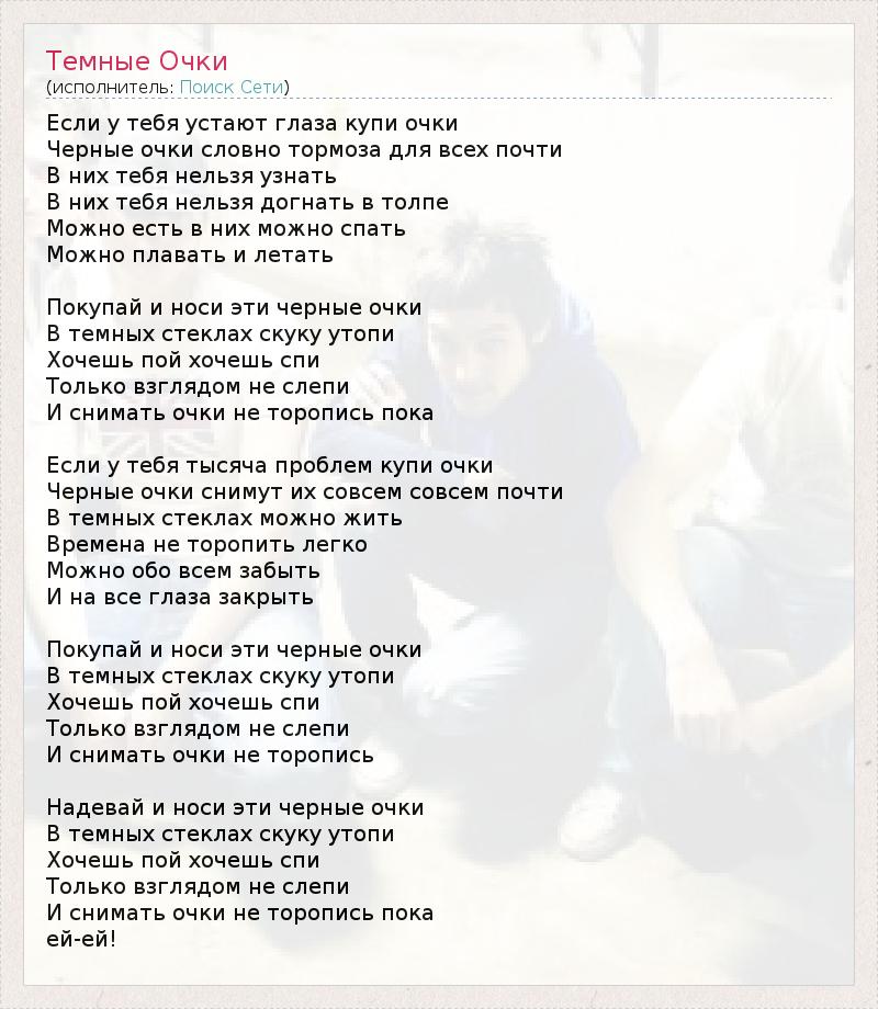 Если у тебя устают глаза купи очки Черные очки словно тормоза для всех почти В них тебя нельзя узнать В них тебя нельзя догнать в толпе Можно есть в них можно спать Можно плавать и летать Покупай и носи эти черные очки В темных стеклах скуку утопи Хочешь пой хочешь спи Только взглядом не слепи И снимать очки не торопись пока Если у тебя тысяча проблем купи очки Черные очки снимут их совсем совсем почти В темных стеклах можно жить Времена не торопить легко Можно обо всем забыть И на все глаза закрыть Покупай и носи эти черные очки В темных стеклах скуку утопи Хочешь пой хочешь спи Только взглядом не слепи И снимать очки не торопись Надевай и носи эти черные очки В темных стеклах скуку утопи Хочешь пой хочешь спи Только взглядом не слепи И снимать очки не торопись пока ей-ей!