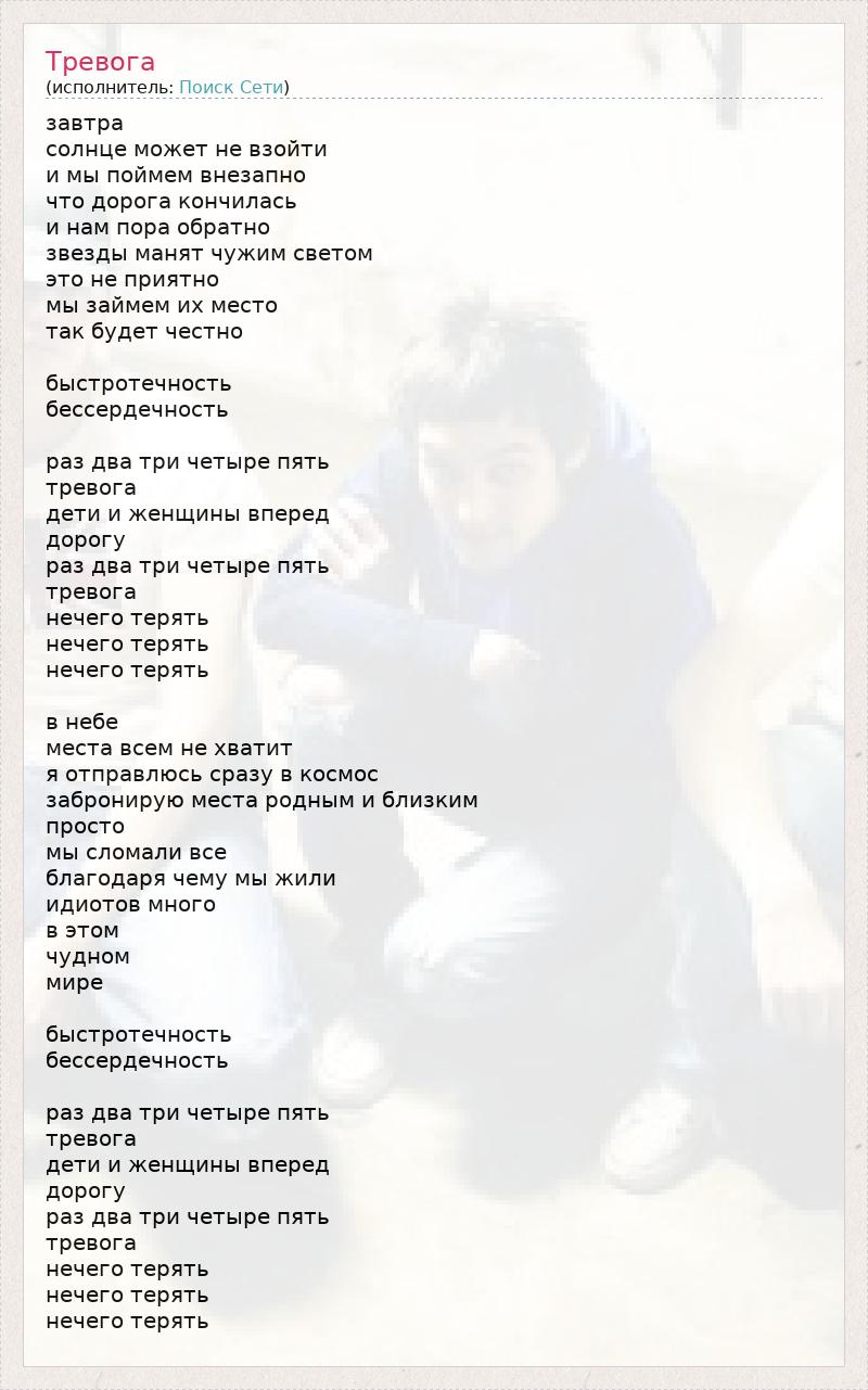 завтра солнце может не взойти и мы поймем внезапно что дорога кончилась и нам пора обратно звезды манят чужим светом это не приятно мы займем их место так будет честно быстротечность бессердечность раз два три четыре пять тревога дети и женщины вперед дорогу раз два три четыре пять тревога нечего терять нечего терять нечего терять в небе места всем не хватит я отправлюсь сразу в космос забронирую места родным и близким просто мы сломали все благодаря чему мы жили идиотов много в этом чудном мире быстротечность бессердечность раз два три четыре пять тревога дети и женщины вперед дорогу раз два три четыре пять тревога нечего терять нечего терять нечего терять