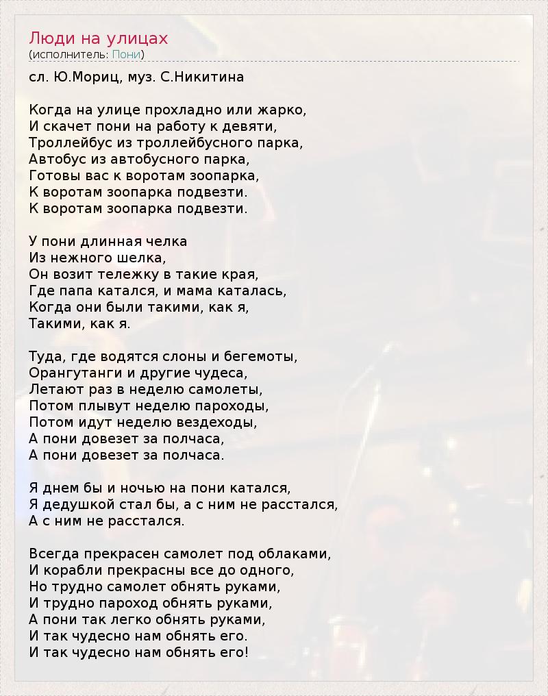 сл. Ю.Мориц, муз. С.Никитина Когда на улице прохладно или жарко, И скачет пони на работу к девяти, Троллейбус из троллейбусного парка, Автобус из автобусного парка, Готовы вас к воротам зоопарка, К воротам зоопарка подвезти. К воротам зоопарка подвезти. У пони длинная челка Из нежного шелка, Он возит тележку в такие края, Где папа катался, и мама каталась, Когда они были такими, как я, Такими, как я. Туда, где водятся слоны и бегемоты, Орангутанги и другие чудеса, Летают раз в неделю самолеты, Потом плывут неделю пароходы, Потом идут неделю вездеходы, А пони довезет за полчаса, А пони довезет за полчаса. Я днем бы и ночью на пони катался, Я дедушкой стал бы, а с ним не расстался, А с ним не расстался. Всегда прекрасен самолет под облаками, И корабли прекрасны все до одного, Но трудно самолет обнять руками, И трудно пароход обнять руками, А пони так легко обнять руками, И так чудесно нам обнять его. И так чудесно нам обнять его!