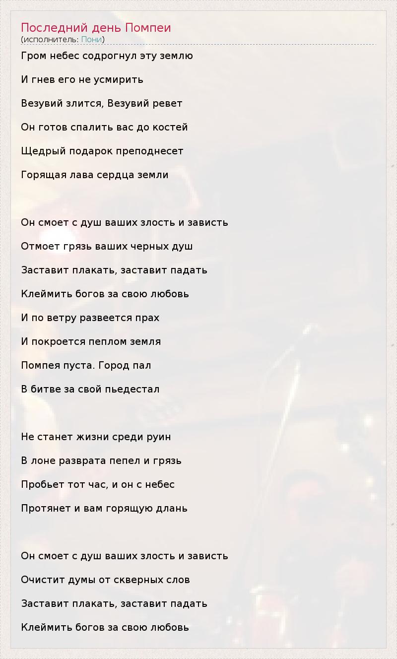 Гром небес содрогнул эту землю И гнев его не усмирить Везувий злится, Везувий ревет Он готов спалить вас до костей Щедрый подарок преподнесет Горящая лава сердца земли Он смоет с душ ваших злость и зависть Отмоет грязь ваших черных душ Заставит плакать, заставит падать Клеймить богов за свою любовь И по ветру развеется прах И покроется пеплом земля Помпея пуста. Город пал В битве за свой пьедестал Не станет жизни среди руин В лоне разврата пепел и грязь Пробьет тот час, и он с небес Протянет и вам горящую длань Он смоет с душ ваших злость и зависть Очистит думы от скверных слов Заставит плакать, заставит падать Клеймить богов за свою любовь Stigmata - Последний день Помпеи - Текст песни, слушать онлайн Stigmata - Последний день Помпеи - Текст песни, слушать онлайн