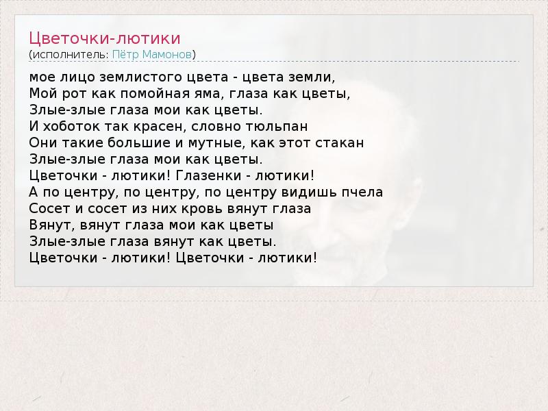 мое лицо землистого цвета - цвета земли, Мой рот как помойная яма, глаза как цветы, Злые-злые глаза мои как цветы. И хоботок так красен, словно тюльпан Они такие большие и мутные, как этот стакан Злые-злые глаза мои как цветы. Цветочки - лютики! Глазенки - лютики! А по центру, по центру, по центру видишь пчела Сосет и сосет из них кровь вянут глаза Вянут, вянут глаза мои как цветы Злые-злые глаза вянут как цветы. Цветочки - лютики! Цветочки - лютики!