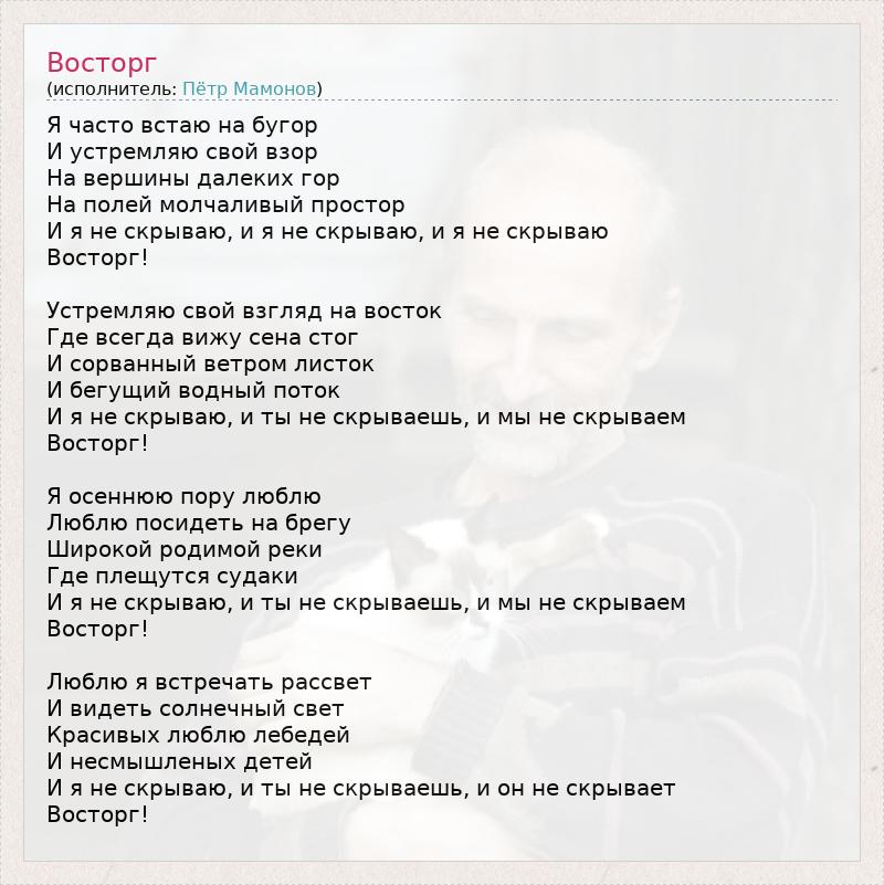 Я часто встаю на бугор И устремляю свой взор На вершины далеких гор На полей молчаливый простор И я не скрываю, и я не скрываю, и я не скрываю Восторг! Устремляю свой взгляд на восток Где всегда вижу сена стог И сорванный ветром листок И бегущий водный поток И я не скрываю, и ты не скрываешь, и мы не скрываем Восторг! Я осеннюю пору люблю Люблю посидеть на брегу Широкой родимой реки Где плещутся судаки И я не скрываю, и ты не скрываешь, и мы не скрываем Восторг! Люблю я встречать рассвет И видеть солнечный свет Красивых люблю лебедей И несмышленых детей И я не скрываю, и ты не скрываешь, и он не скрывает Восторг!