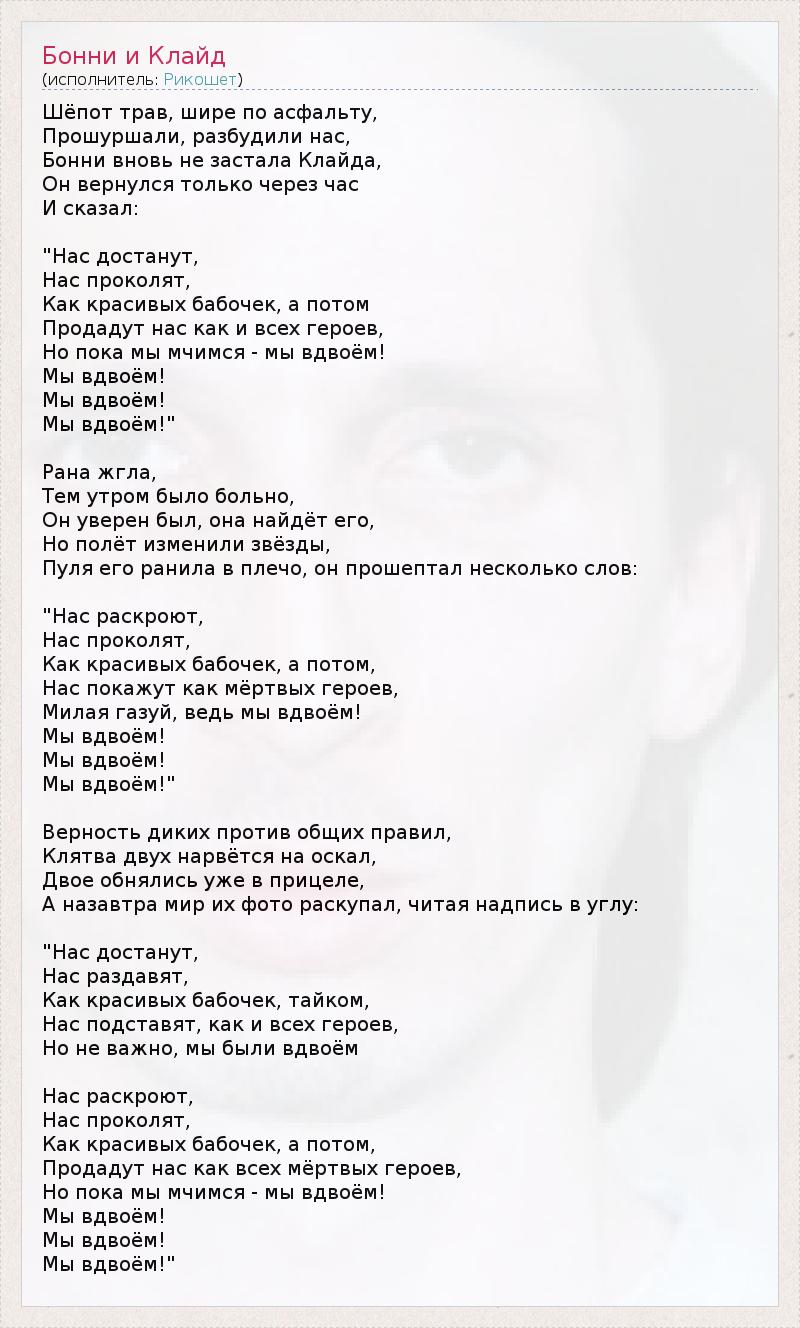 Шёпот трав, шире по асфальту, Прошуршали, разбудили нас, Бонни вновь не застала Клайда, Он вернулся только через час И сказал: "Нас достанут, Нас проколят, Как красивых бабочек, а потом Продадут нас как и всех героев, Но пока мы мчимся - мы вдвоём! Мы вдвоём! Мы вдвоём! Мы вдвоём!" Рана жгла, Тем утром было больно, Он уверен был, она найдёт его, Но полёт изменили звёзды, Пуля его ранила в плечо, он прошептал несколько слов: "Нас раскроют, Нас проколят, Как красивых бабочек, а потом, Нас покажут как мёртвых героев, Милая газуй, ведь мы вдвоём! Мы вдвоём! Мы вдвоём! Мы вдвоём!" Верность диких против общих правил, Клятва двух нарвётся на оскал, Двое обнялись уже в прицеле, А назавтра мир их фото раскупал, читая надпись в углу: "Нас достанут, Нас раздавят, Как красивых бабочек, тайком, Нас подставят, как и всех героев, Но не важно, мы были вдвоём Нас раскроют, Нас проколят, Как красивых бабочек, а потом, Продадут нас как всех мёртвых героев, Но пока мы мчимся - мы вдвоём! Мы вдвоём! Мы вдвоём! Мы вдвоём!"