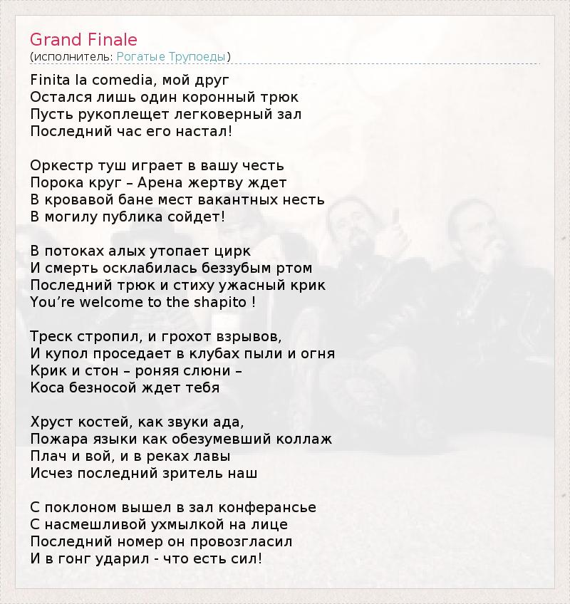 Finita la comedia, мой друг Остался лишь один коронный трюк Пусть рукоплещет легковерный зал Последний час его настал! Оркестр туш играет в вашу честь Порока круг – Арена жертву ждет В кровавой бане мест вакантных несть В могилу публика сойдет! В потоках алых утопает цирк И смерть осклабилась беззубым ртом Последний трюк и стиху ужасный крик You’re welcome to the shapito ! Треск стропил, и грохот взрывов, И купол проседает в клубах пыли и огня Крик и стон – роняя слюни – Коса безносой ждет тебя Хруст костей, как звуки ада, Пожара языки как обезумевший коллаж Плач и вой, и в реках лавы Исчез последний зритель наш С поклоном вышел в зал конферансье С насмешливой ухмылкой на лице Последний номер он провозгласил И в гонг ударил - что есть сил!