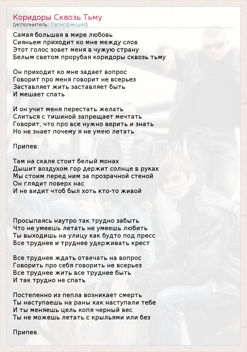 Самая большая в мире любовь Сияньем приходит ко мне между слов Этот голос зовет меня в чужую страну Белым светом прорубая коридоры сквозь тьму Он приходит ко мне задает вопрос Говорит про меня говорит не всерьез Заставляет жить заставляет быть И мешает спать И он учит меня перестать желать Слиться с тишиной запрещает мечтать Говорит, что про все нужно верить и знать Но не знает почему я не умею летать Припев: Там на скале стоит белый монах Дышит воздухом гор держит солнце в руках Мы стоим перед ним за прозрачной стеной Он глядит поверх нас И не видит чтоб был хоть кто-то живой Просыпаясь наутро так трудно забыть Что не умеешь летать не умеешь любить Ты выходишь на улицу как будто под пресс Все труднее и труднее удерживать крест Все труднее ждать отвечать на вопрос Говорить про себя говорить не всерьез Все труднее жить все труднее быть И так трудно не спать Постепенно из пепла возникает смерть Ты наступаешь на раны как наступали тебе И ты меняешь цель копя черный вес Ты не можешь летать с крыльями или без Припев.