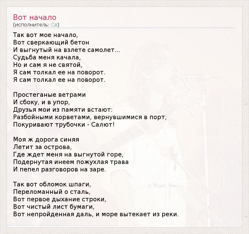Так вот мое начало, Вот сверкающий бетон И выгнутый на взлете самолет... Судьба меня качала, Но и сам я не святой, Я сам толкал ее на поворот. Я сам толкал ее на поворот. Простеганые ветрами И сбоку, и в упор, Друзья мои из памяти встают: Разбойными корветами, вернувшимися в порт, Покуривают трубочки - Салют! Моя ж дорога синяя Летит за острова, Где ждет меня на выгнутой горе, Подернутая инеем пожухлая трава И пепел разговоров на заре. Так вот обломок шпаги, Переломанный о сталь, Вот первое дыхание строки, Вот чистый лист бумаги, Вот непройденная даль, и море вытекает из реки.