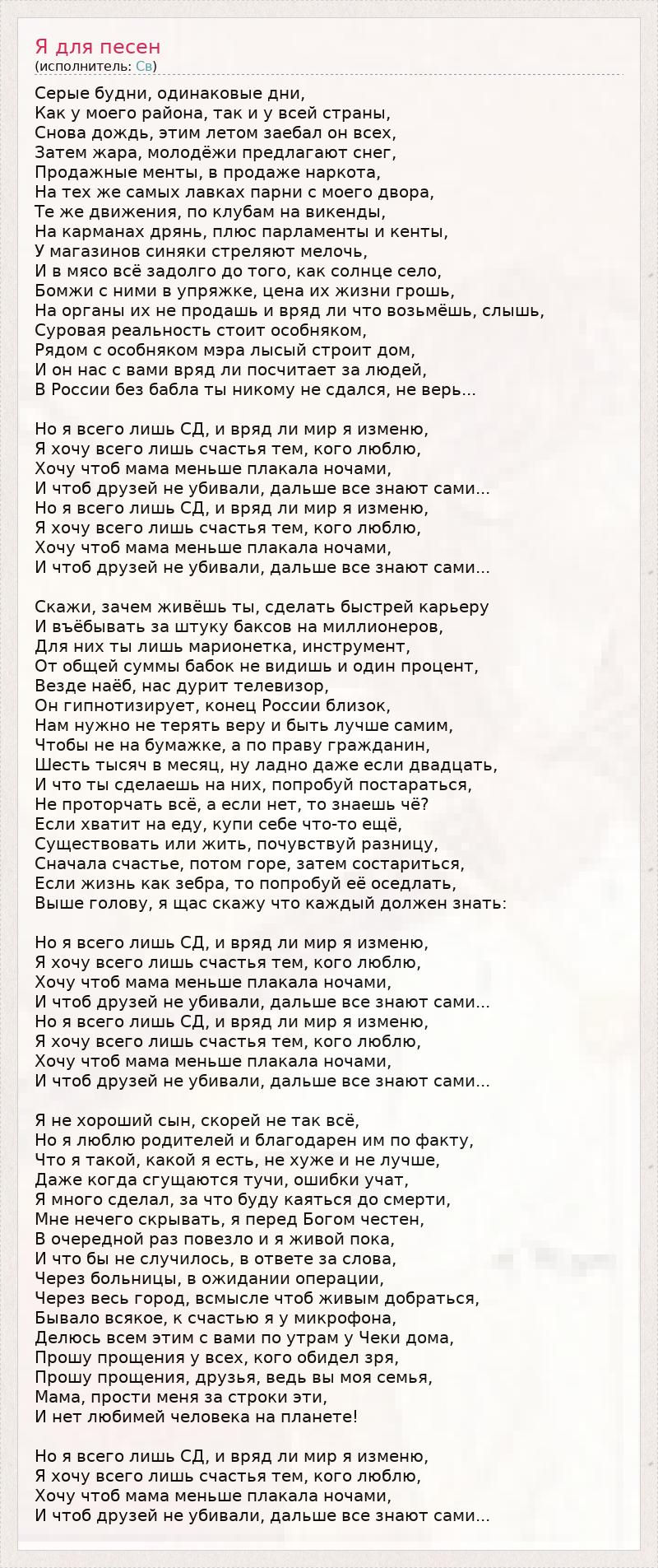 Серые будни, одинаковые дни, Как у моего района, так и у всей страны, Снова дождь, этим летом заебал он всех, Затем жара, молодёжи предлагают снег, Продажные менты, в продаже наркота, На тех же самых лавках парни с моего двора, Те же движения, по клубам на викенды, На карманах дрянь, плюс парламенты и кенты, У магазинов синяки стреляют мелочь, И в мясо всё задолго до того, как солнце село, Бомжи с ними в упряжке, цена их жизни грошь, На органы их не продашь и вряд ли что возьмёшь, слышь, Суровая реальность стоит особняком, Рядом с особняком мэра лысый строит дом, И он нас с вами вряд ли посчитает за людей, В России без бабла ты никому не сдался, не верь... Но я всего лишь СД, и вряд ли мир я изменю, Я хочу всего лишь счастья тем, кого люблю, Хочу чтоб мама меньше плакала ночами, И чтоб друзей не убивали, дальше все знают сами... Но я всего лишь СД, и вряд ли мир я изменю, Я хочу всего лишь счастья тем, кого люблю, Хочу чтоб мама меньше плакала ночами, И чтоб друзей не убивали, дальше все знают сами... Скажи, зачем живёшь ты, сделать быстрей карьеру И въёбывать за штуку баксов на миллионеров, Для них ты лишь марионетка, инструмент, От общей суммы бабок не видишь и один процент, Везде наёб, нас дурит телевизор, Он гипнотизирует, конец России близок, Нам нужно не терять веру и быть лучше самим, Чтобы не на бумажке, а по праву гражданин, Шесть тысяч в месяц, ну ладно даже если двадцать, И что ты сделаешь на них, попробуй постараться, Не проторчать всё, а если нет, то знаешь чё? Если хватит на еду, купи себе что-то ещё, Существовать или жить, почувствуй разницу, Сначала счастье, потом горе, затем состариться, Если жизнь как зебра, то попробуй её оседлать, Выше голову, я щас скажу что каждый должен знать: Но я всего лишь СД, и вряд ли мир я изменю, Я хочу всего лишь счастья тем, кого люблю, Хочу чтоб мама меньше плакала ночами, И чтоб друзей не убивали, дальше все знают сами... Но я всего лишь СД, и вряд ли мир я изменю, Я хочу всего лишь счастья тем, кого люблю, Хочу чтоб мама меньше плакала ночами, И чтоб друзей не убивали, дальше все знают сами... Я не хороший сын, скорей не так всё, Но я люблю родителей и благодарен им по факту, Что я такой, какой я есть, не хуже и не лучше, Даже когда сгущаются тучи, ошибки учат, Я много сделал, за что буду каяться до смерти, Мне нечего скрывать, я перед Богом честен, В очередной раз повезло и я живой пока, И что бы не случилось, в ответе за слова, Через больницы, в ожидании операции, Через весь город, всмысле чтоб живым добраться, Бывало всякое, к счастью я у микрофона, Делюсь всем этим с вами по утрам у Чеки дома, Прошу прощения у всех, кого обидел зря, Прошу прощения, друзья, ведь вы моя семья, Мама, прости меня за строки эти, И нет любимей человека на планете! Но я всего лишь СД, и вряд ли мир я изменю, Я хочу всего лишь счастья тем, кого люблю, Хочу чтоб мама меньше плакала ночами, И чтоб друзей не убивали, дальше все знают сами...