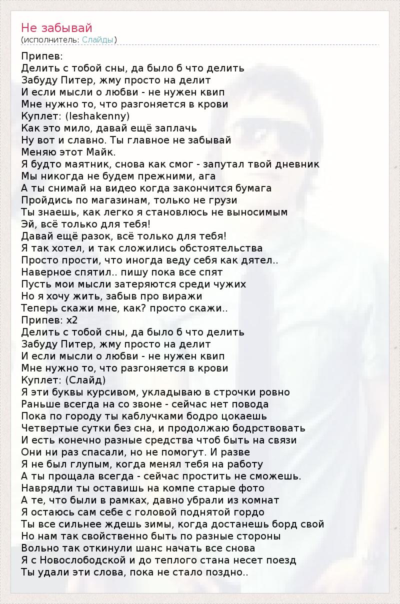 Припев: Делить с тобой сны, да было б что делить Забуду Питер, жму просто на делит И если мысли о любви - не нужен квип Мне нужно то, что разгоняется в крови Куплет: (leshakenny) Как это мило, давай ещё заплачь Ну вот и славно. Ты главное не забывай Меняю этот Майк. Я будто маятник, снова как смог - запутал твой дневник Мы никогда не будем прежними, ага А ты снимай на видео когда закончится бумага Пройдись по магазинам, только не грузи Ты знаешь, как легко я становлюсь не выносимым Эй, всё только для тебя! Давай ещё разок, всё только для тебя! Я так хотел, и так сложились обстоятельства Просто прости, что иногда веду себя как дятел.. Наверное спятил.. пишу пока все спят Пусть мои мысли затеряются среди чужих Но я хочу жить, забыв про виражи Теперь скажи мне, как? просто скажи.. Припев: x2 Делить с тобой сны, да было б что делить Забуду Питер, жму просто на делит И если мысли о любви - не нужен квип Мне нужно то, что разгоняется в крови Куплет: (Слайд) Я эти буквы курсивом, укладываю в строчки ровно Раньше всегда на со звоне - сейчас нет повода Пока по городу ты каблучками бодро цокаешь Четвертые сутки без сна, и продолжаю бодрствовать И есть конечно разные средства чтоб быть на связи Они ни раз спасали, но не помогут. И разве Я не был глупым, когда менял тебя на работу А ты прощала всегда - сейчас простить не сможешь. Наврядли ты оставишь на компе старые фото А те, что были в рамках, давно убрали из комнат Я остаюсь сам себе с головой поднятой гордо Ты все сильнее ждешь зимы, когда достанешь борд свой Но нам так свойственно быть по разные стороны Вольно так откинули шанс начать все снова Я с Новослободской и до теплого стана несет поезд Ты удали эти слова, пока не стало поздно..