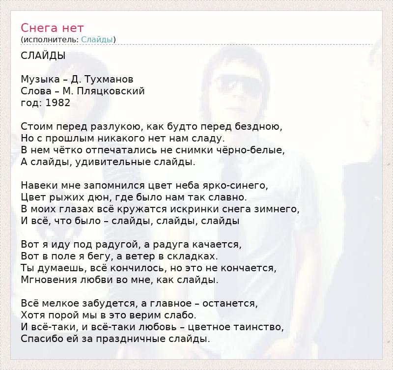 СЛАЙДЫ Музыка – Д. Тухманов Слова – М. Пляцковский год: 1982 Стоим перед разлукою, как будто перед бездною, Но с прошлым никакого нет нам сладу. В нем чётко отпечатались не снимки чёрно-белые, А слайды, удивительные слайды. Навеки мне запомнился цвет неба ярко-синего, Цвет рыжих дюн, где было нам так славно. В моих глазах всё кружатся искринки снега зимнего, И всё, что было – слайды, слайды, слайды Вот я иду под радугой, а радуга качается, Вот в поле я бегу, а ветер в складках. Ты думаешь, всё кончилось, но это не кончается, Мгновения любви во мне, как слайды. Всё мелкое забудется, а главное – останется, Хотя порой мы в это верим слабо. И всё-таки, и всё-таки любовь – цветное таинство, Спасибо ей за праздничные слайды.