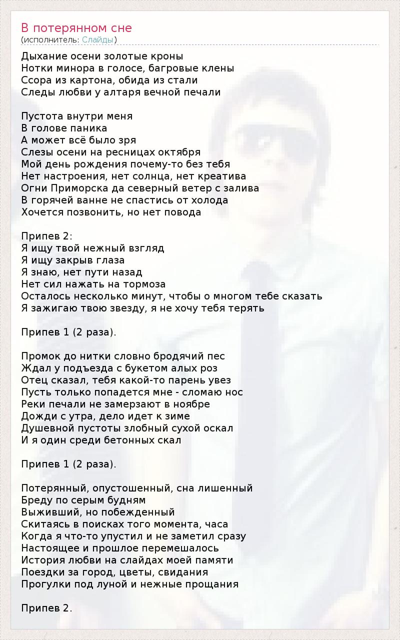 Дыхание осени золотые кроны Нотки минора в голосе, багровые клены Ссора из картона, обида из стали Следы любви у алтаря вечной печали Пустота внутри меня В голове паника А может всё было зря Слезы осени на ресницах октября Мой день рождения почему-то без тебя Нет настроения, нет солнца, нет креатива Огни Приморска да северный ветер с залива В горячей ванне не спастись от холода Хочется позвонить, но нет повода Припев 2: Я ищу твой нежный взгляд Я ищу закрыв глаза Я знаю, нет пути назад Нет сил нажать на тормоза Осталось несколько минут, чтобы о многом тебе сказать Я зажигаю твою звезду, я не хочу тебя терять Припев 1 (2 раза). Промок до нитки словно бродячий пес Ждал у подъезда с букетом алых роз Отец сказал, тебя какой-то парень увез Пусть только попадется мне - сломаю нос Реки печали не замерзают в ноябре Дожди с утра, дело идет к зиме Душевной пустоты злобный сухой оскал И я один среди бетонных скал Припев 1 (2 раза). Потерянный, опустошенный, сна лишенный Бреду по серым будням Выживший, но побежденный Скитаясь в поисках того момента, часа Когда я что-то упустил и не заметил сразу Настоящее и прошлое перемешалось История любви на слайдах моей памяти Поездки за город, цветы, свидания Прогулки под луной и нежные прощания Припев 2.