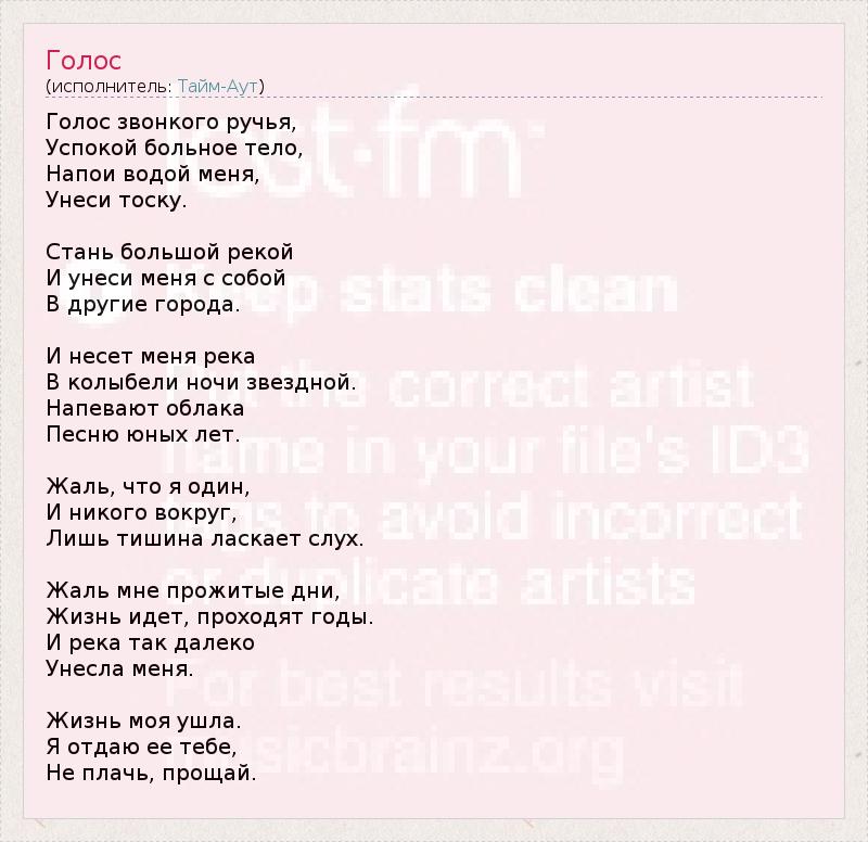 Голос звонкого ручья, Успокой больное тело, Напои водой меня, Унеси тоску. Стань большой рекой И унеси меня с собой В другие города. И несет меня река В колыбели ночи звездной. Напевают облака Песню юных лет. Жаль, что я один, И никого вокруг, Лишь тишина ласкает слух. Жаль мне прожитые дни, Жизнь идет, проходят годы. И река так далеко Унесла меня. Жизнь моя ушла. Я отдаю ее тебе, Не плачь, прощай.