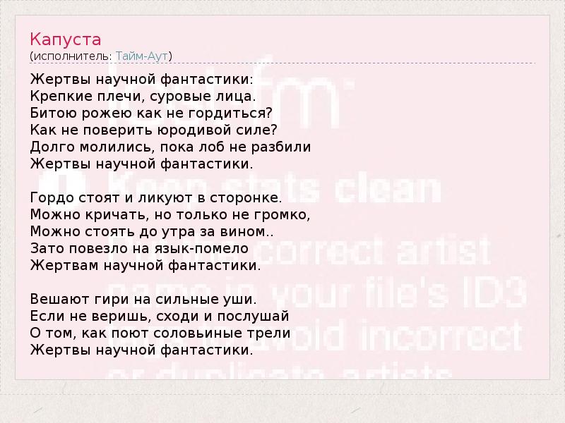 Жертвы научной фантастики: Крепкие плечи, суровые лица. Битою рожею как не гордиться? Как не поверить юродивой силе? Долго молились, пока лоб не разбили Жертвы научной фантастики. Гордо стоят и ликуют в сторонке. Можно кричать, но только не громко, Можно стоять до утра за вином.. Зато повезло на язык-помело Жертвам научной фантастики. Вешают гири на сильные уши. Если не веришь, сходи и послушай О том, как поют соловьиные трели Жертвы научной фантастики.
