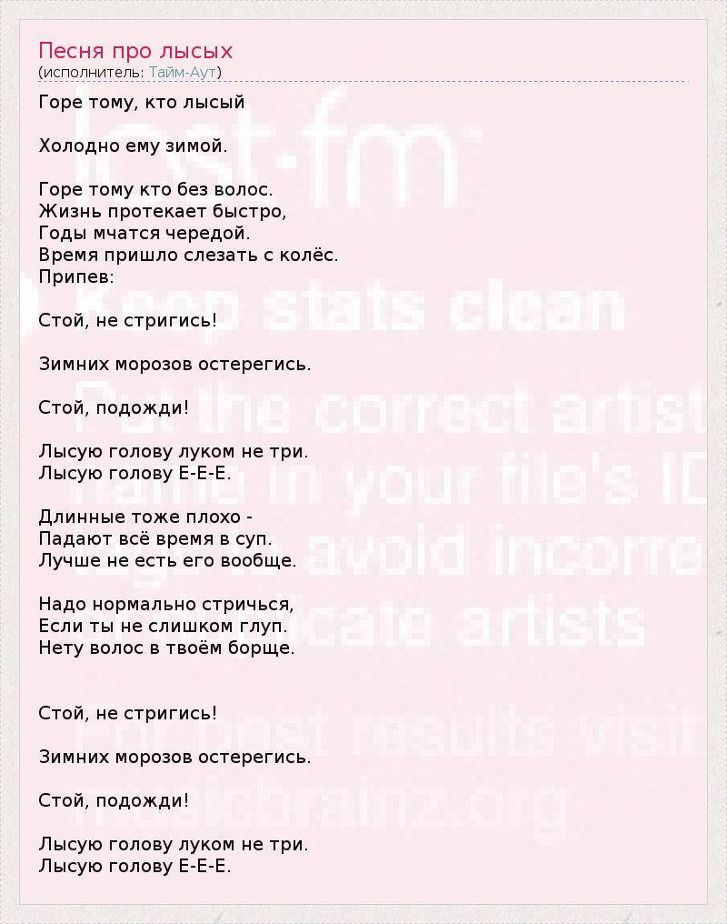 Горе тому, кто лысый Холодно ему зимой. Горе тому кто без волос. Жизнь протекает быстро, Годы мчатся чередой. Время пришло слезать с колёс. Припев: Стой, не стригись! Зимних морозов остерегись. Стой, подожди! Лысую голову луком не три. Лысую голову Е-Е-Е. Длинные тоже плохо - Падают всё время в суп. Лучше не есть его вообще. Надо нормально стричься, Если ты не слишком глуп. Нету волос в твоём борще. Стой, не стригись! Зимних морозов остерегись. Стой, подожди! Лысую голову луком не три. Лысую голову Е-Е-Е.