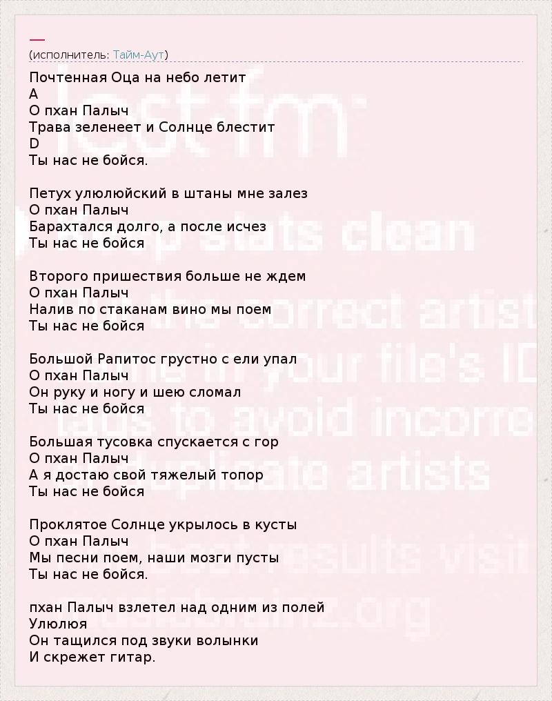 Почтенная Оца на небо летит A О пхан Палыч Трава зеленеет и Солнце блестит D Ты нас не бойся. Петух улюлюйский в штаны мне залез О пхан Палыч Барахтался долго, а после исчез Ты нас не бойся Второго пришествия больше не ждем О пхан Палыч Налив по стаканам вино мы поем Ты нас не бойся Большой Рапитос грустно с ели упал О пхан Палыч Он руку и ногу и шею сломал Ты нас не бойся Большая тусовка спускается с гор О пхан Палыч А я достаю свой тяжелый топор Ты нас не бойся Проклятое Солнце укрылось в кусты О пхан Палыч Мы песни поем, наши мозги пусты Ты нас не бойся. пхан Палыч взлетел над одним из полей Улюлюя Он тащился под звуки волынки И скрежет гитар.